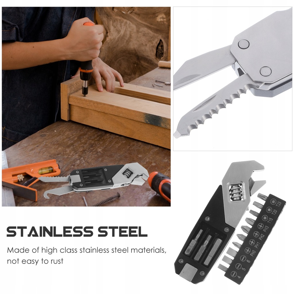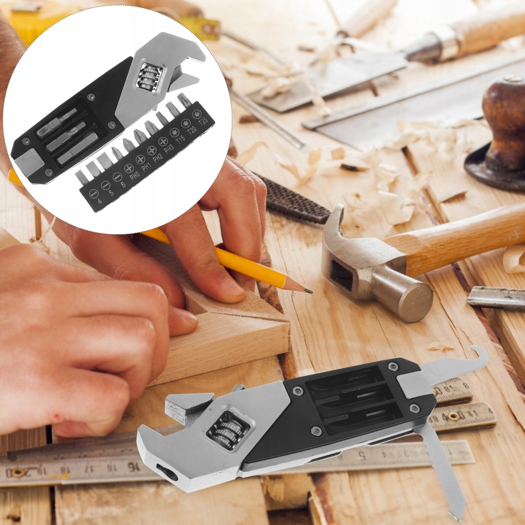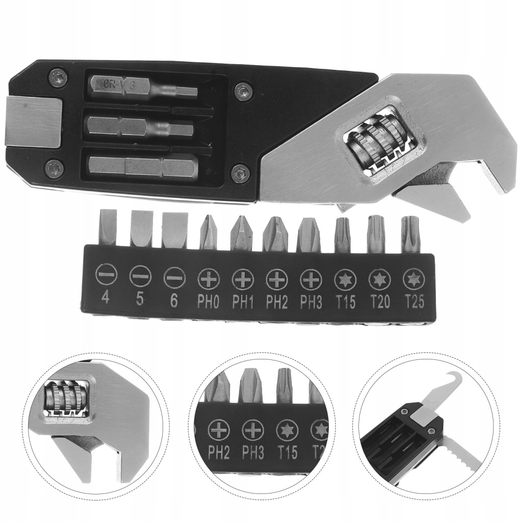 Multifunctional: tighten screw, adjustable wrench, cut off the rope, replace the bit, etc.