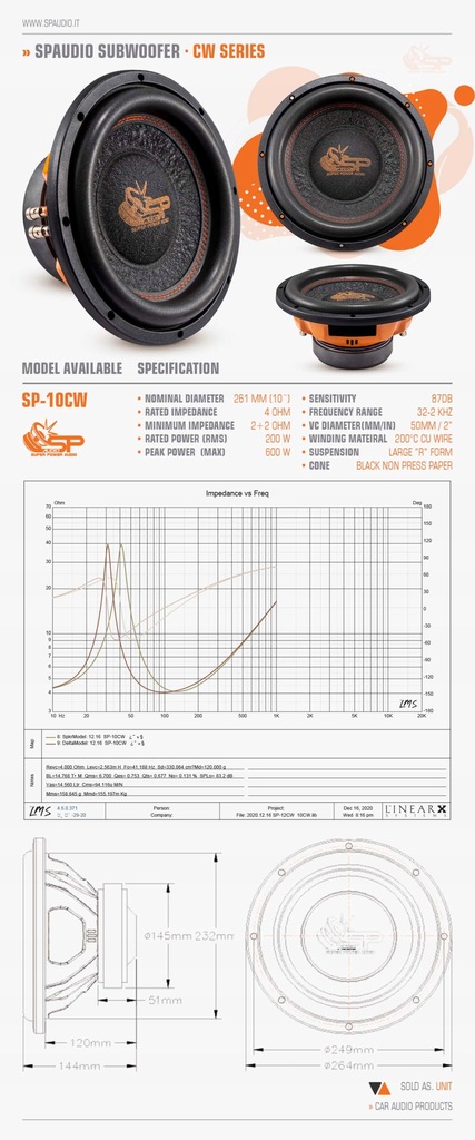 Subwoofery serii SP AUDIO SP-10CW przechodzą rygorystyczne testy, aby zapewnić najwyższą jakość dźwięku. Ich aluminiowe kosze zapewniają sztywność i trwałość, a stożki z nieprasowanego papieru oraz efektywne zawiesiny gwarantują doskonałą wydajność. Subwoofer można zasilać tradycyjnym wzmacniaczem klasy AB lub monofonicznym wzmacniaczem D, nie przekraczając zalecanej mocy, aby uniknąć uszkodzeń.