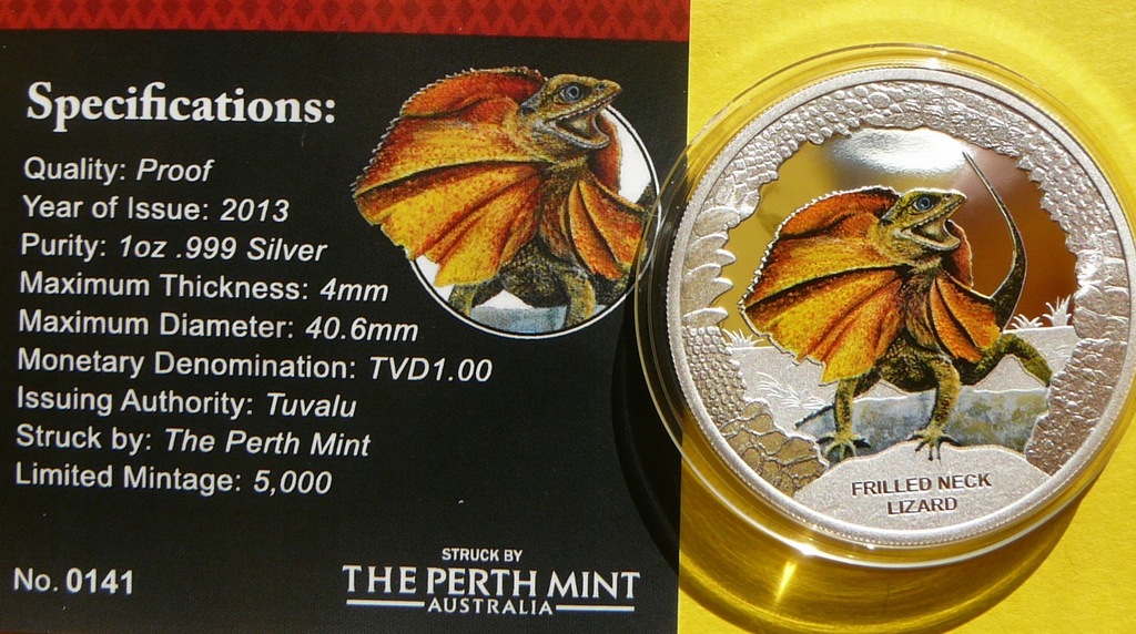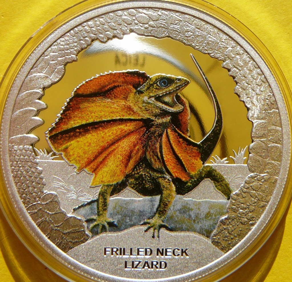 NA AUKCJI WYSTAWIANA JEST PRZEPIĘKNA RZADKA SREBRNA MONETA KOLEKCJONERSKA - DOLLAR - TUVALU 2013 - AGAMA KOŁNIERZASTA - GADY AUSTRALII - CZYSTE SREBRO PRÓBY 999 - KOLOR - STEMPEL LUSTRZANY - MENNICZA - RARYTAS - RZADKA - NAKŁAD TYLKO 5.000 SZTUK !! + CERTYFIKAT AUTENTYCZNOŚCI - NA INNYCH AUKCJACH WYSTAWIAM MONETY Z TEJ SERII - ZAPRASZAM DO OBEJRZENIA