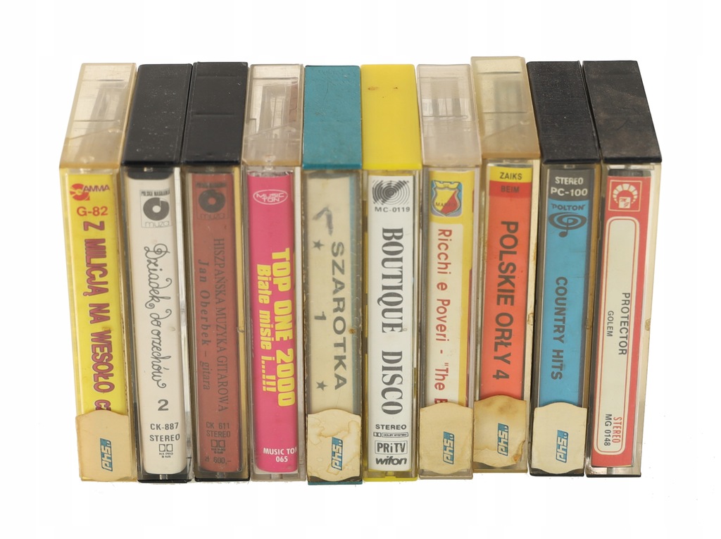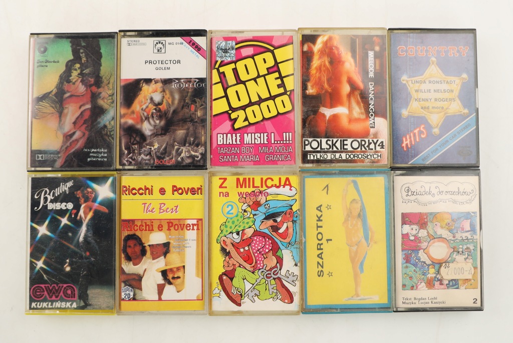 Komplet 10 kaset magnetofonowych: Protector "Golem", Jan Oberbek "Hiszpańska muzyka gitarowa", "Top One 2000", "Country Hits", Ricchi e Poveri "The best", bajka muzyczna "Dziadek do orzechów", "Szarotka 1", Ewa Kuklińska "Boutiquw Disco", "Polskie Orły 4", "Z milicją na wesoło 2". Ślady użytkowania. Polecam kolekcjonerom