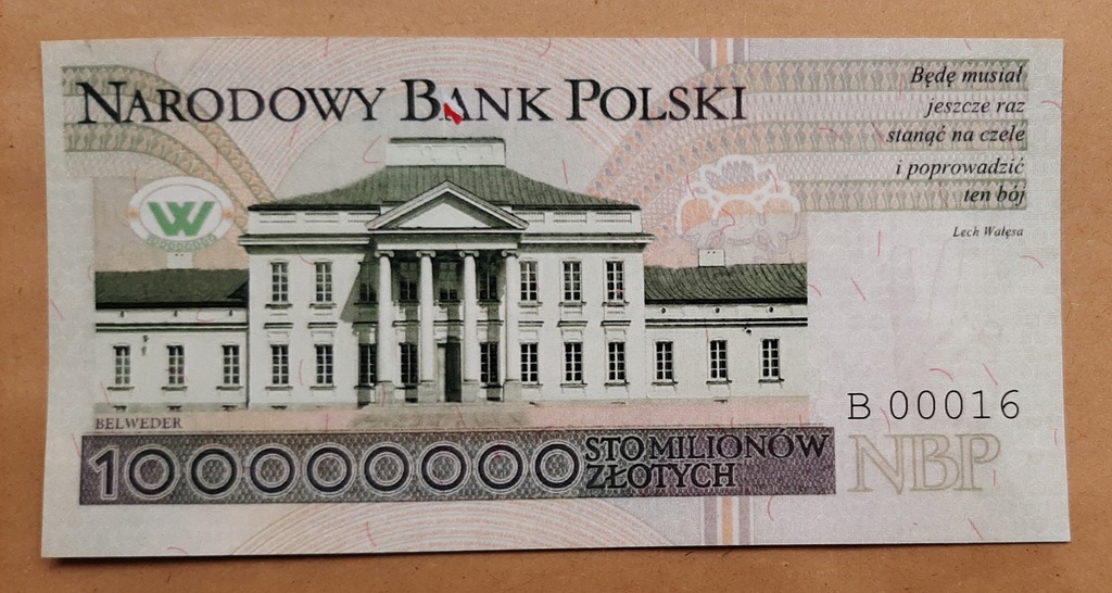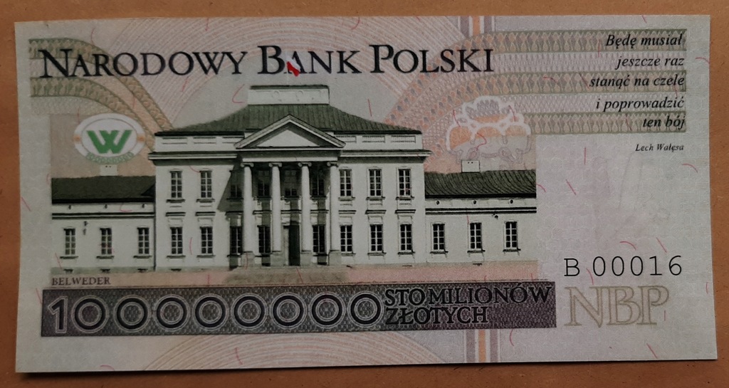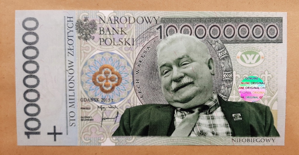 Polecam bardzo unikatową wersję współczesnego banknotu 100 zł z 1994 r. z popiersiem Lecha Wałęsy jako banknot o nominale 100000000 zł.
