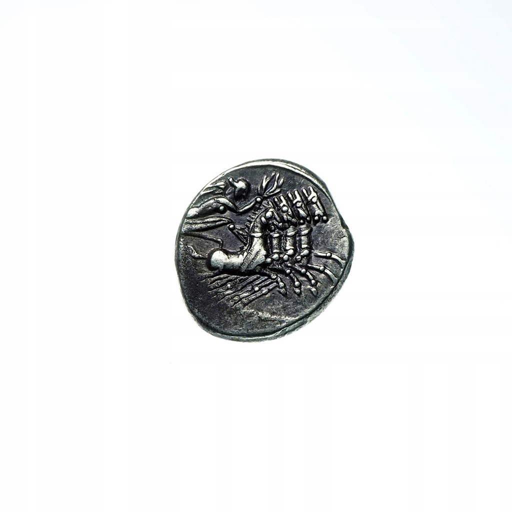 Moneta jak na zdjęciu. Krążek wyśmienicie zachowany, w przyjemnej, stonowanej, szarawej patynie, spod której widoczny jest menniczy blask. Rewelacyjnie zachowane szczegóły reliefu, bez przytarć (nawet widoczne oczka koników), troszkę niecentryczne bicie. Stan zachowania grubo powyżej przeciętnej I-/II+ (przełom AU/MS). Srebro, waga 3,91. Katalog: Crawford 275/1.