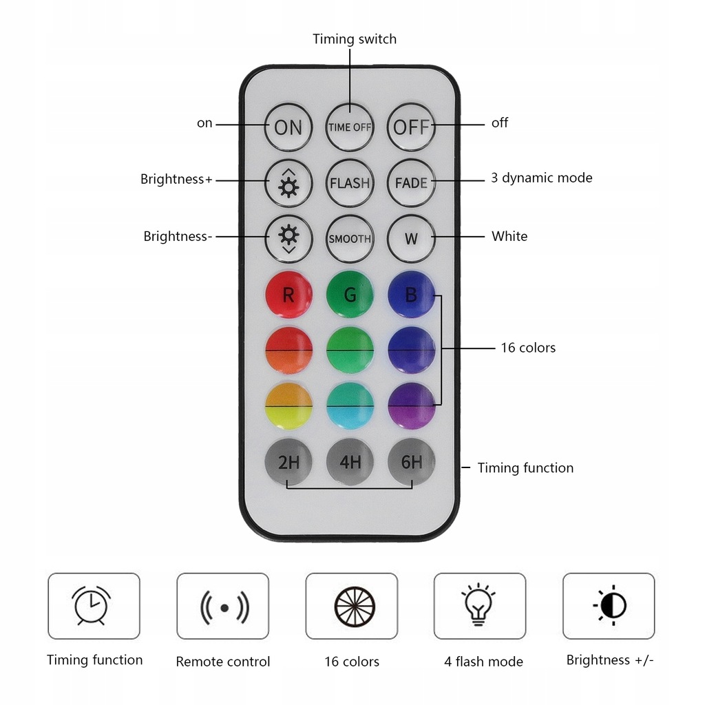 - Funkcja zdalnego sterowania: 16 rodzajów kolorów świata + 4 rodzaje trybów emitowania świata + ściemnianie + synchronizacja (2H/4H/6H)