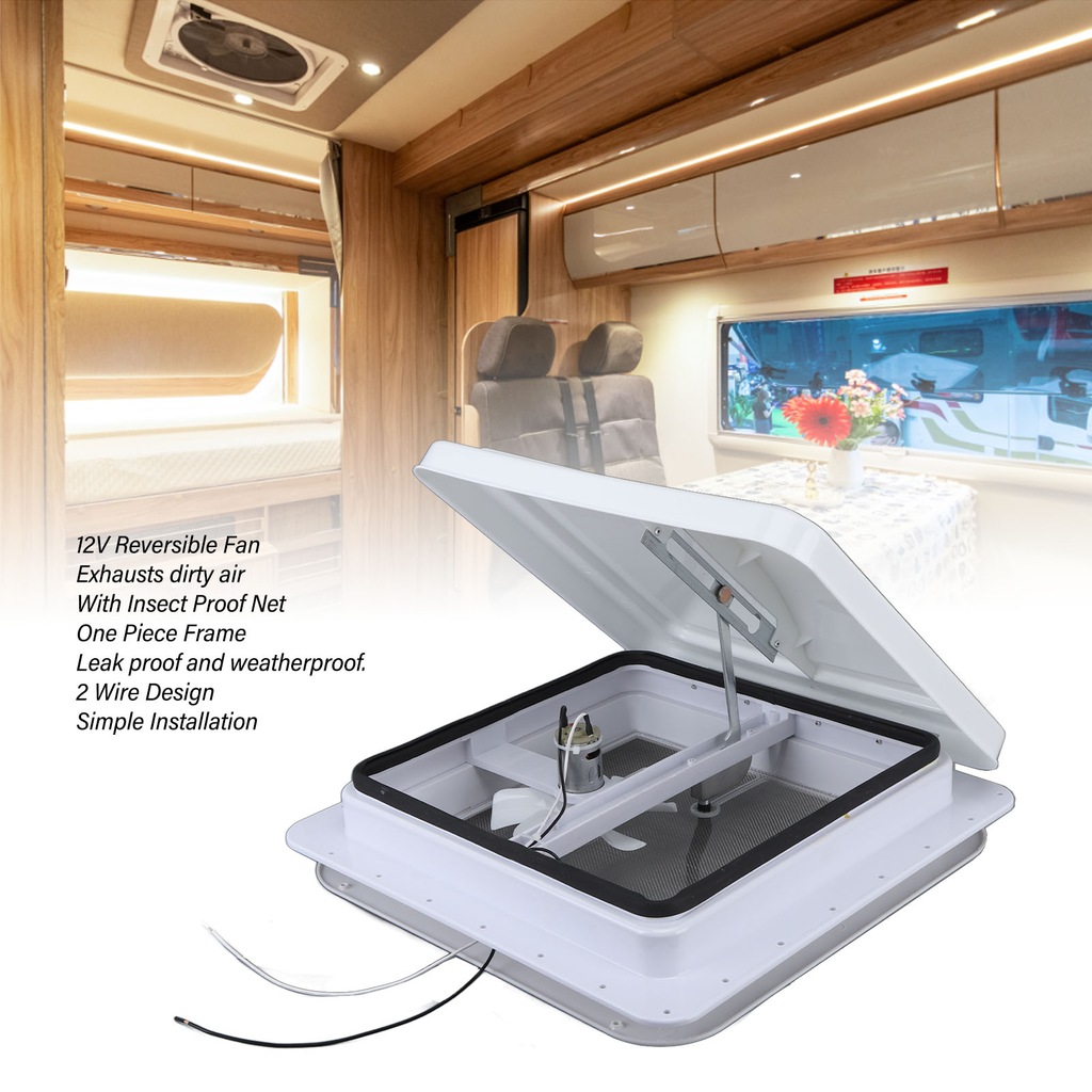 1. Wentylator odwracalny 12 V: Ten otwór wentylacyjny sufitowy jest wyposażony w wentylator odwracalny 12 V, który usuwa brudne powietrze i wciąga świeże powietrze do samochodu kempingowego, kampera lub zamkniętej przyczepy.