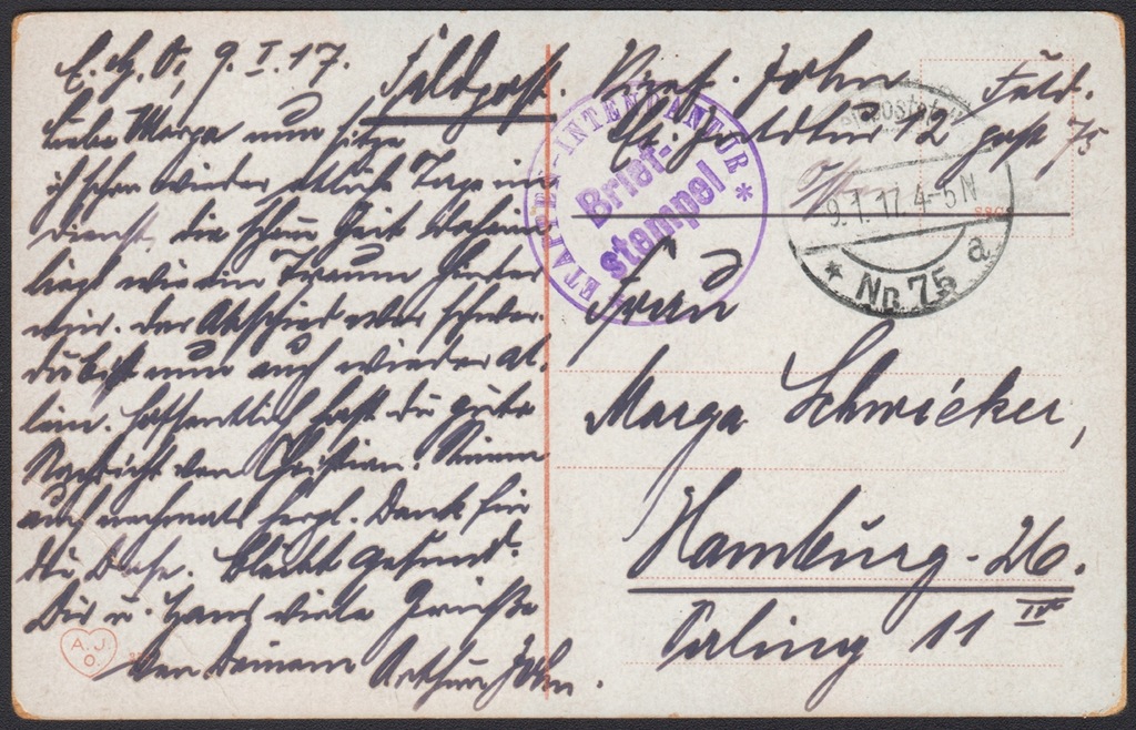 1917 Białystok. Ulica Instytucka, na drugim planie widać stojący samochód, karta podbarwiana litograficznie, z obiegu pocztowego, wydanie A.J. Ostrowskiego; wysłana 9.1.17 przez niemiecką pocztę polową nr.75 do Niemiec, okrągła pieczęć formacyjna "ETAPPEN -INTENDENTUR Brief-stempel".