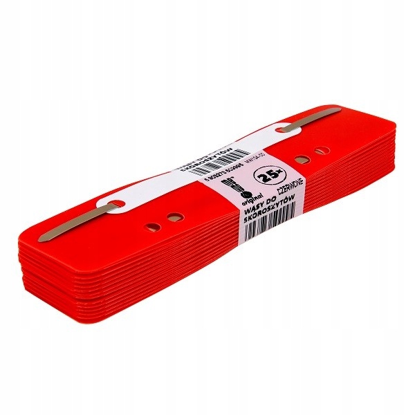 Wąsy do skoroszytów MemoBe. Długość 15 cm i szerokość 3,4 cm. Elementy z mechanizmem skoroszytowym, z metalową taśmą mocującą. Posiadają dziurowanie o rozstawie oczek 6-8 cm do włożenia do segregatora. Zestaw zawiera 25 sztuk w czerwonym kolorze.