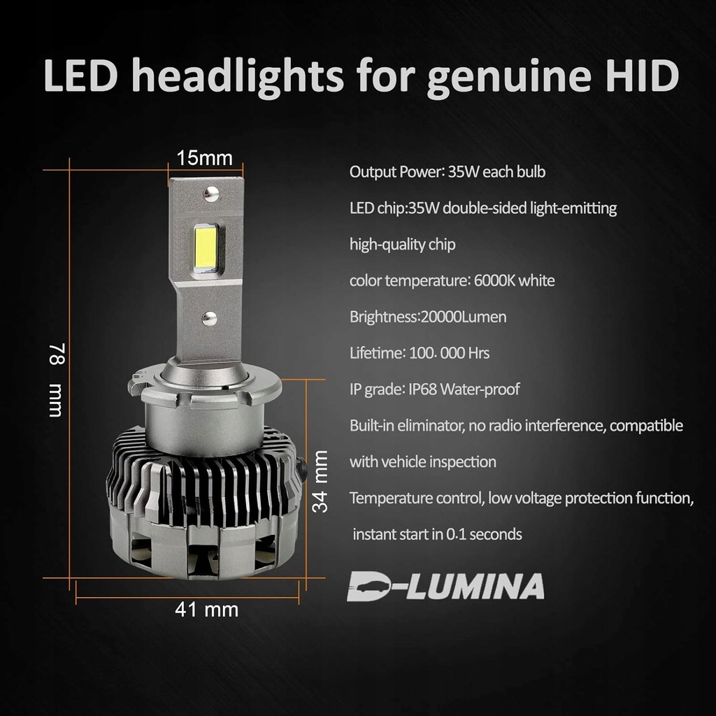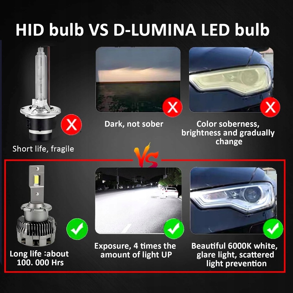 ?300% jaśniejsza niż żarówka ksenonowa?: Żarówki LED D2S są wykonane z wysokiej jakości diod LED, bieli ksenonowej 6500 K, napięcia DC 9–32 V, wysokiej jasności 8000 lumenów na żarówkę, + 300% jaśniejszej niż standardowe żarówki ksenonowe.