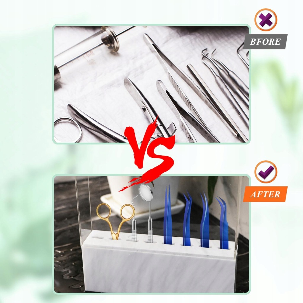 Rozmiar: 6.9x1.65x6.38 cala, każdy uchwyt na pincetę może pomieścić 8 pincet, każdy otwór pasuje do większości rozmiarów pincety.