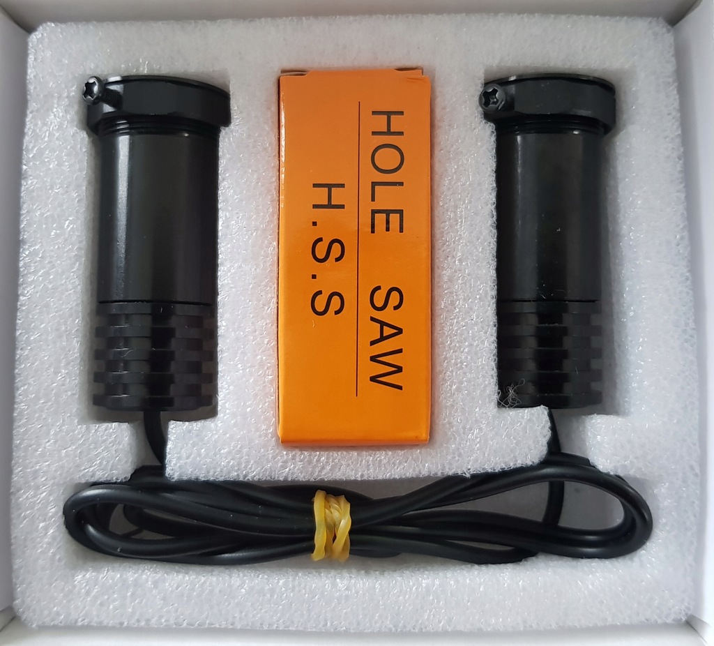 Oferta dotyczy kompletu dwóch rzutników LED z logo Opel w aluminiowej obudowie z otwornicą.