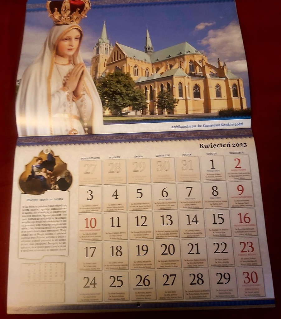 JAK CO ROKU ZAPRASZAM DO ZAKUPU NA WOŚP PIĘKNEGO KALENDARZA NA KREDOWYM PAPIERZE FORMATU 2XA4 ( Z OTWOREM DO ZAWIESZENIA) 12 WESTCHNIEŃ DO MARYI NA 12 STRONACH Z PIĘKNYMI ILUSTRACJAMI. NA JEDNEJ STRONIE JEDEN MIESIĄC ZAZNACZONE ŚWIĘTA,IMIENINY I PRZYPADAJĄCE NA KAŻDY DZIEŃ WSPOMNIENIA LITURGICZNE.