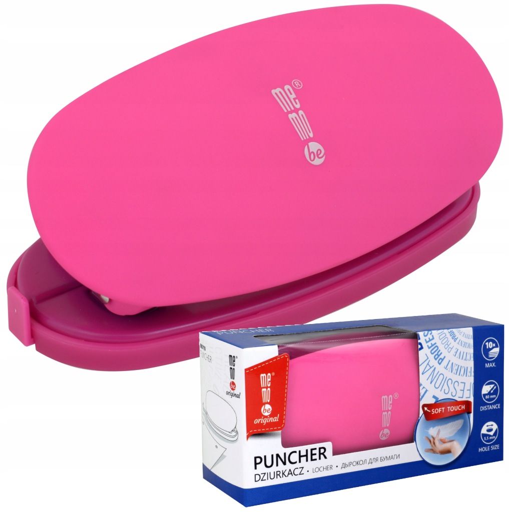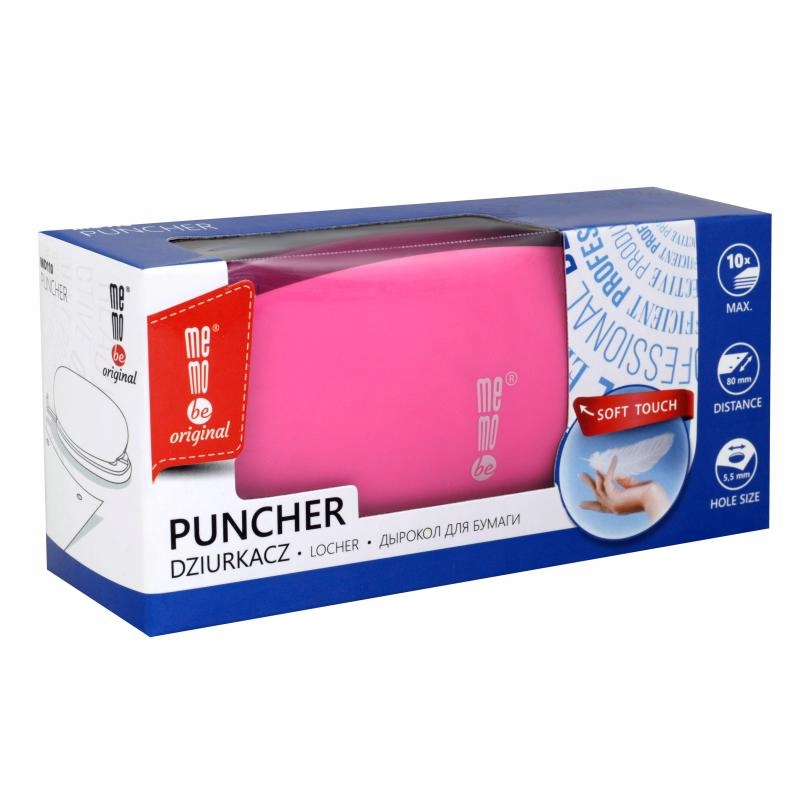 Dziurkacz Soft-Touch w kolorze różowym pastelowym z wytrzymałego, miękkiego i delikatnego w dotyku tworzywa. Dziurkuje jednorazowo do 10 arkuszy papieru (80 g/m2) na szerokość 80mm. Średnica otworów wykonanych w papierze to 5,5mm. Produkt dostępny jest w czterech kolorach: różowym, niebieskim, niebieskim pastelowym i czarnym.