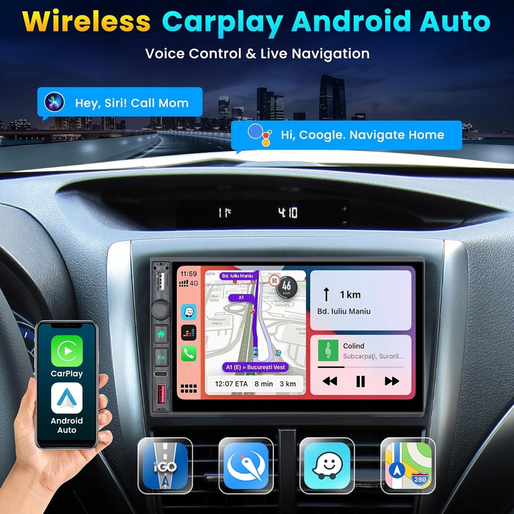 Radio samochodowe 2 DIN z Android Auto i CarPlay – bezprzewodowe i przewodowe połączenie z telefonem przez Bluetooth lub USB. Obsługa kontaktów, wiadomości, map, nawigacji, muzyki i sterowania głosowego. Dodatkowo radio wspiera funkcję Mirror Link (łącze lustrzane).