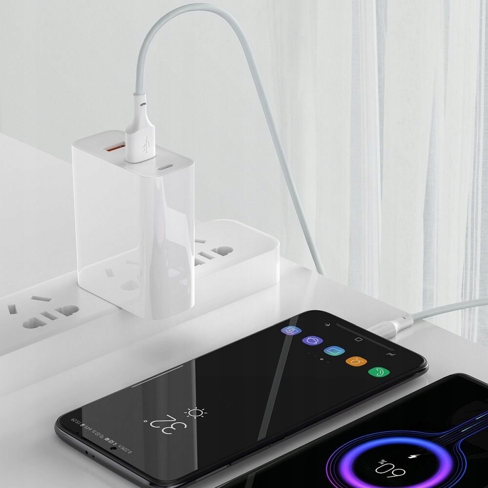 Zestaw dwóch kabli typu C. Każdy zapewnia bezpieczne zasilanie oraz swobodny transfer danych z prędkością 480 MB/s. Współpracuje z zasilaczami do 2,4A.