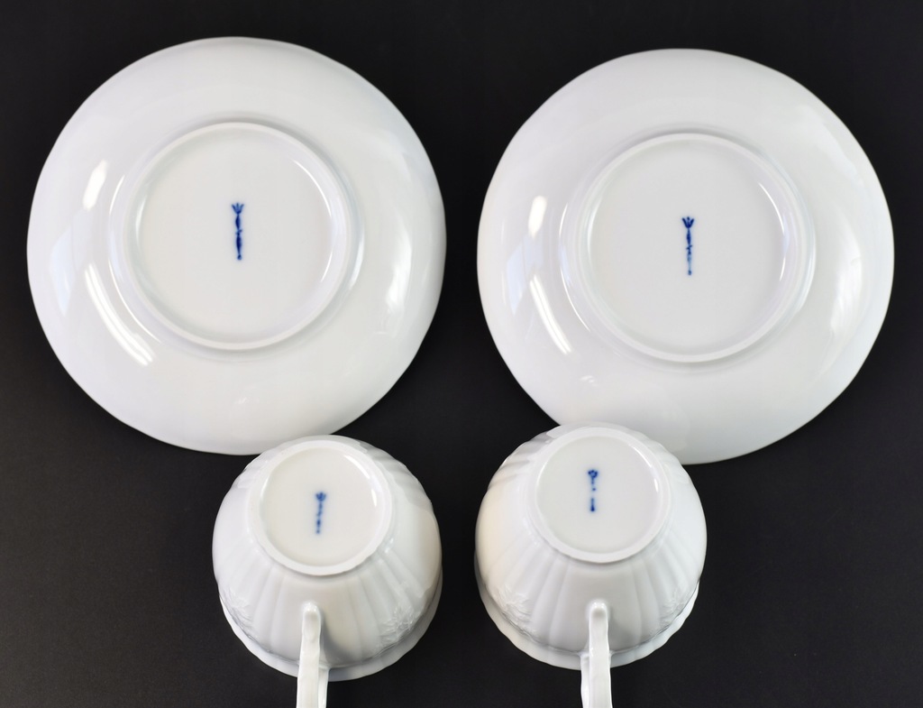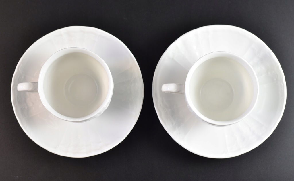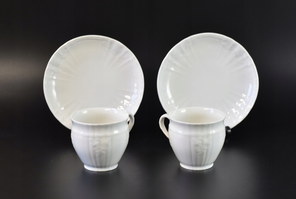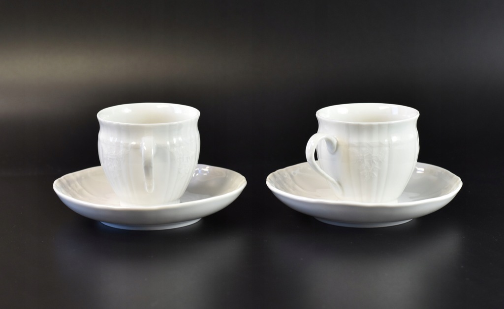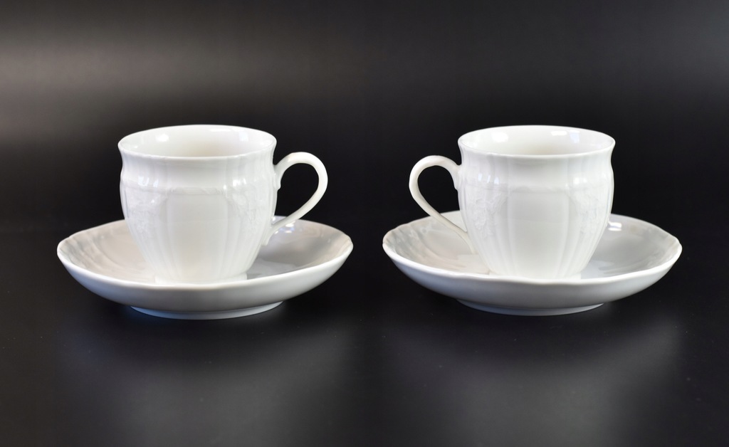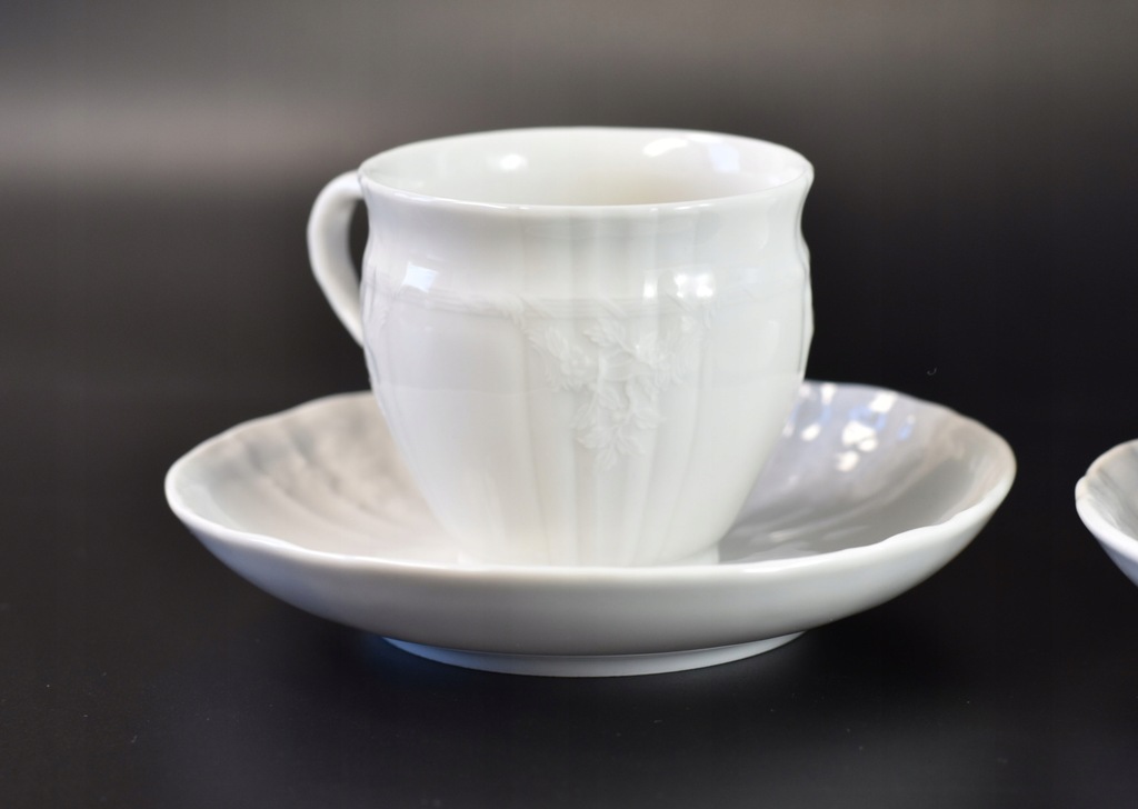 Dwie filiżanki do mokki KPM Berlin Rocaille. Połączenie pięknej bieli porcelany z delikatnymi, ozdobnymi reliefami.