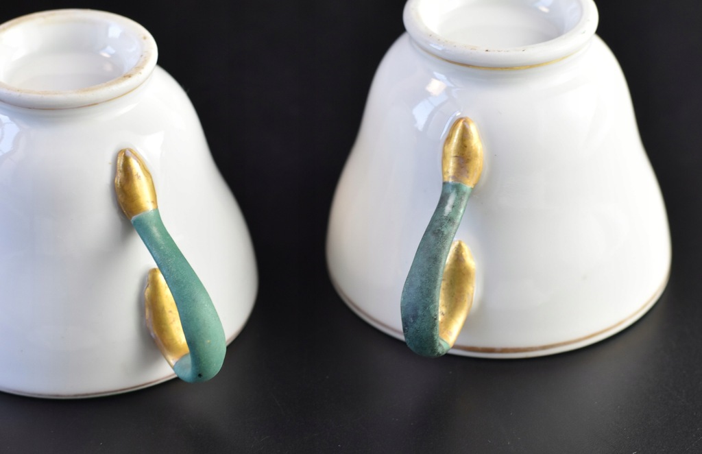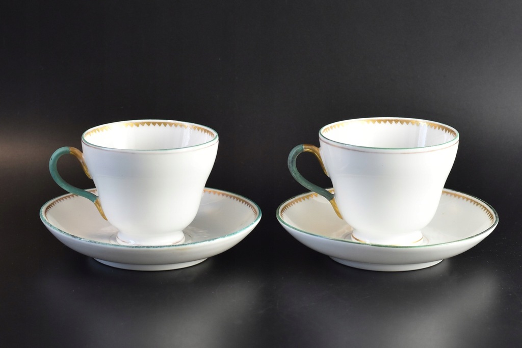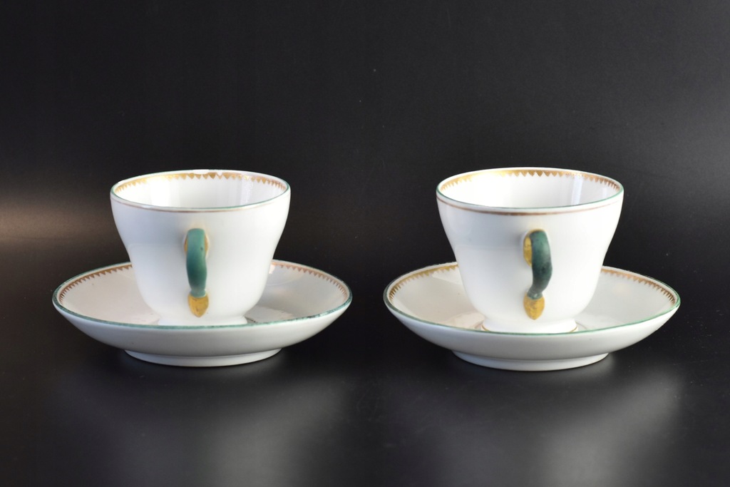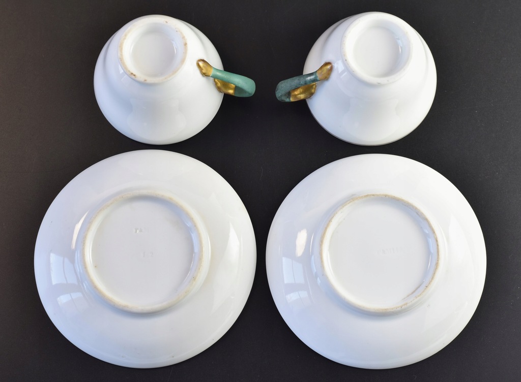 Dwie zgrabne filiżanki ze spodkami z manufaktury Fischer & Mieg, która mieściła się w miejscowości Pirkenhammmer (dzisiaj Brezova / Czechy).