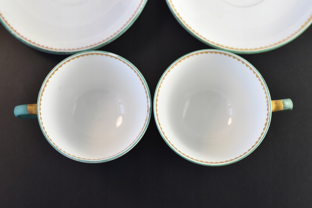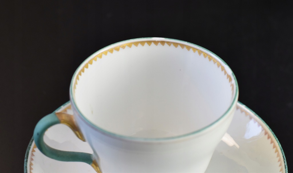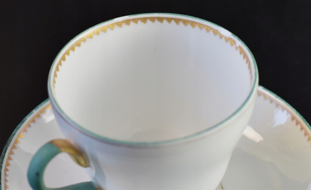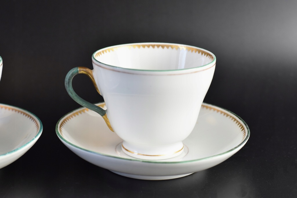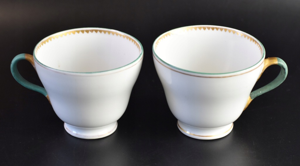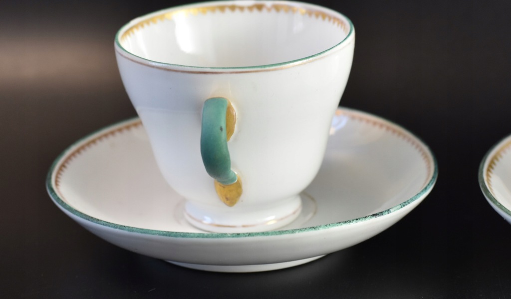 Stan: dobry z wiekowymi śladami użytkowania; jedna filiżanka ma na racie po wewnętrznej stronie trzy delikatne, płaskie odpryski.