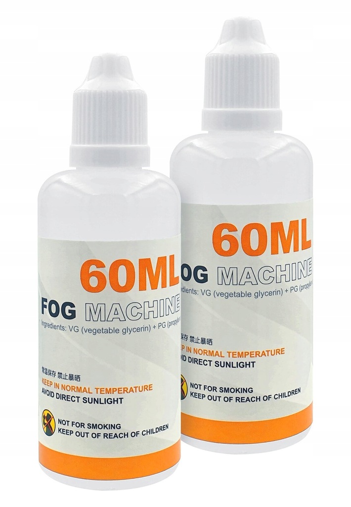 Zestaw dwóch butelek z zapasowym liquidem do generatora dymu Lensgo Smoke B. Każda z nich zawiera 60 ml specjalnego płynu na bazie gliceryny roślinnej i glikolu propylenowego.