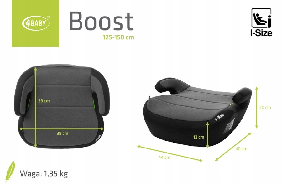 BOOST (125-150 CM) Fotelik Boost i-Size stworzony jest z myślą o starszych dzieciach o wzroście 125-150 cm . Został wykonany i przetestowany zgodnie z najbardziej restrykcyjną homologacją R129 . Podwyższone podłokietniki zapewniają optymalne prowadzenie pasa, a skorupa z tworzywa sztucznego jest sprawdzona pod kątem największych obciążeń. Boost montowany jest za pomocą 3-punktowych pasów samochodowych, dzięki czemu pasuje do samochodów bez systemu isofix.