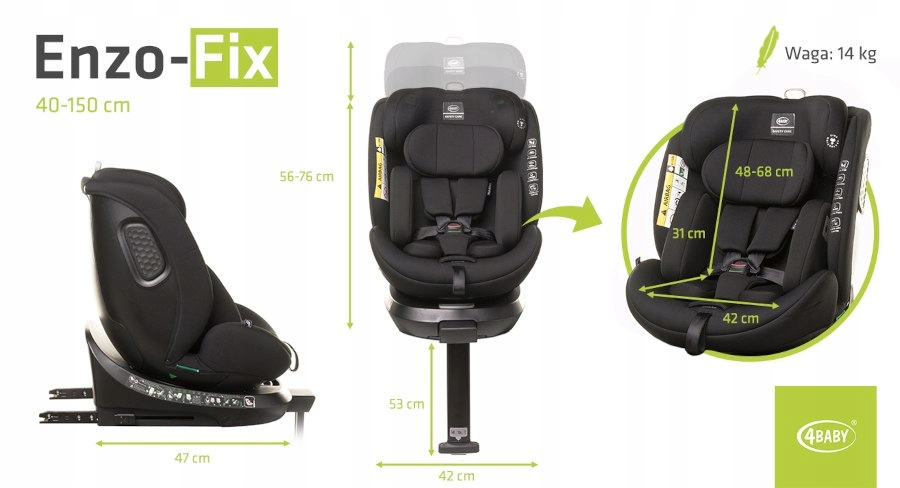 Fotelik 4BABY ENZO-FIX należy do nowej generacji fotelików samochodowych, które spełniają wymagania najbardziej restrykcyjnej normy bezpieczeństwa homologacji R129 / I-size. Gwarantuje to najwyższą ochronę dziecku o wzroście od 40 do 150 cm. Enzo-fix jest zintegrowany z obrotową bazą wyposażoną w system Isofix oraz nogę stabilizacyjną wraz z sygnalizatorami poprawnego montażu.Funkcja obrotu o 360°, umożliwia łatwą zmianę kierunku jazdy montażu, a także komfortowe zapinanie malca do w foteliku, jak i wyjmowanie go z samochodu.Fotelik Enzo-fix jest montowany tyłem do kierunki jazdy (RWF) aż do wzrostu 105 cm małego pasażera (czyli około 4 lat), a bezpieczną i komfortową podróż zapewni mu 5-stopniowa regulacja siedziska w zakresie 132-145°. Natomiast podróż przodem do kierunku jazdy jest możliwa od 76 do 150 cm w 5-stopniowej regulacji o zakresie od 108° do 121°. Modułowa budowa fotelika umożliwia dopasowanie do dziecka na każdym etapie rozwoju. Noworodki i niemowlęta korzystają ze specjalnej wkładki redukcyjnej, która wypełnia fotelik i wypłaszcza pozycję dziecka, gwarantując mu poprawne fizjoloficznie ułożenie ciała. 5-punktowe pasy bezpieczeństwa w foteliku posiadają nakładki naramienne oraz nakładkę na pas krokowy, dbające, by mocno zaciągnięte pasy nie psuły dobrego samopoczucia dziecka. Dla wygody nieco większych dzieci fotelik wyposażony jest w 15-punktową regulację zagłówka, co pozwala na optymalne dopasowanie go do wzrostu dziecka.Specjalne panele boczne w foteliku dbają o to, aby w trakcie zderzenia bocznego jeszcze lepiej chronić dziecko przed konsekwencjami uderzenia. Panele absorbują energię uderzenia, przez co nie są one skierowane na małego pasażera.