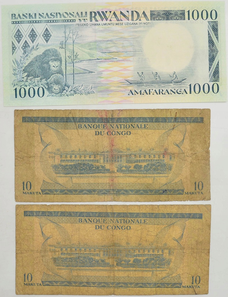 - Opis: W zestawie znajdują się banknoty o nominale: Congo - 10 Makuta 1968, 1970 (St.4); Rwanda - 1 000 Franków 1988 (St.1)