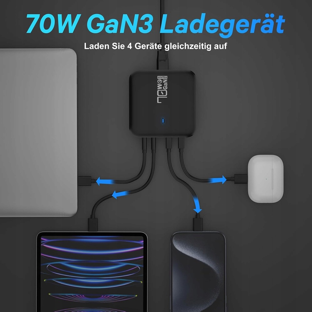 AVUMDA 70W 4-portowa ładowarka USB-C PD 3.0 GaN III – szybkie ładowanie 4 urządzeń jednocześnie.