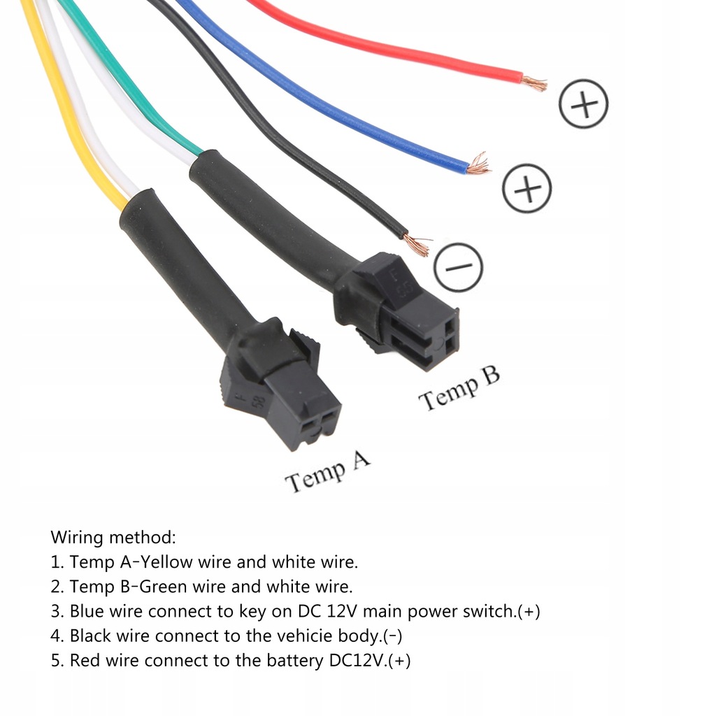 - 5. Czerwony przewód podłącz do akumulatora DC12V.(+) 6. Temperatura silnika: złącze należy zamontować na świecy zapłonowej, a czujnik połączyć ze złączem