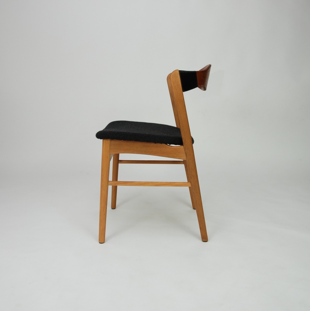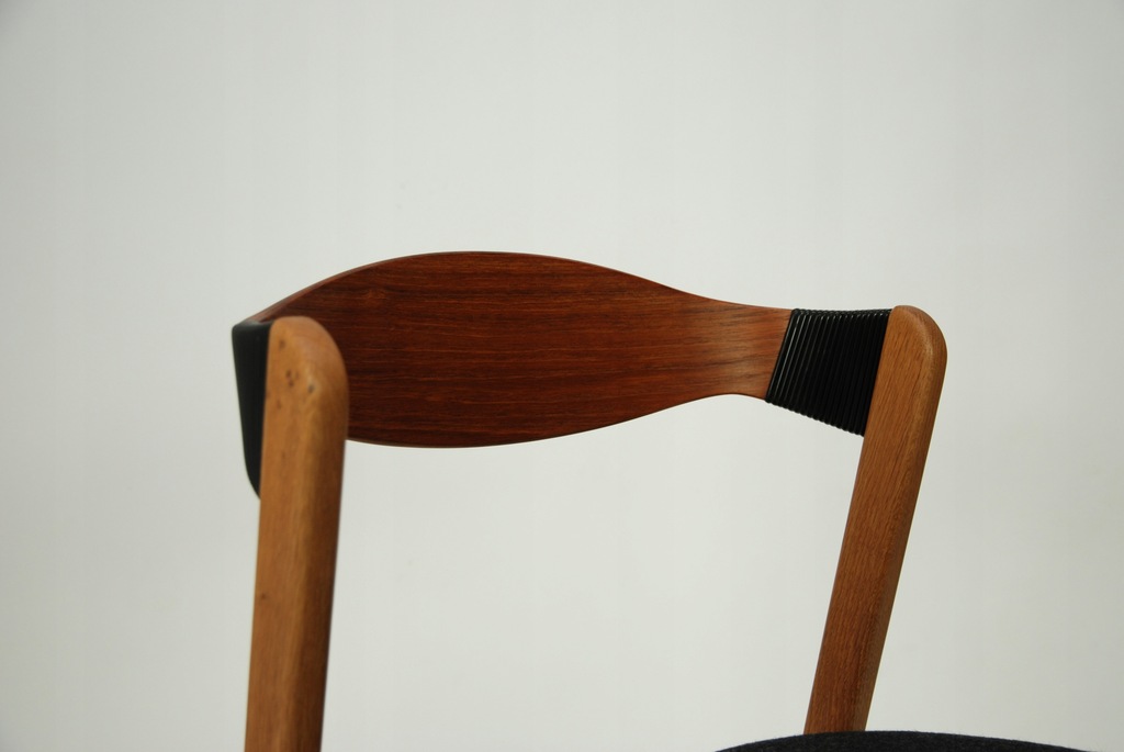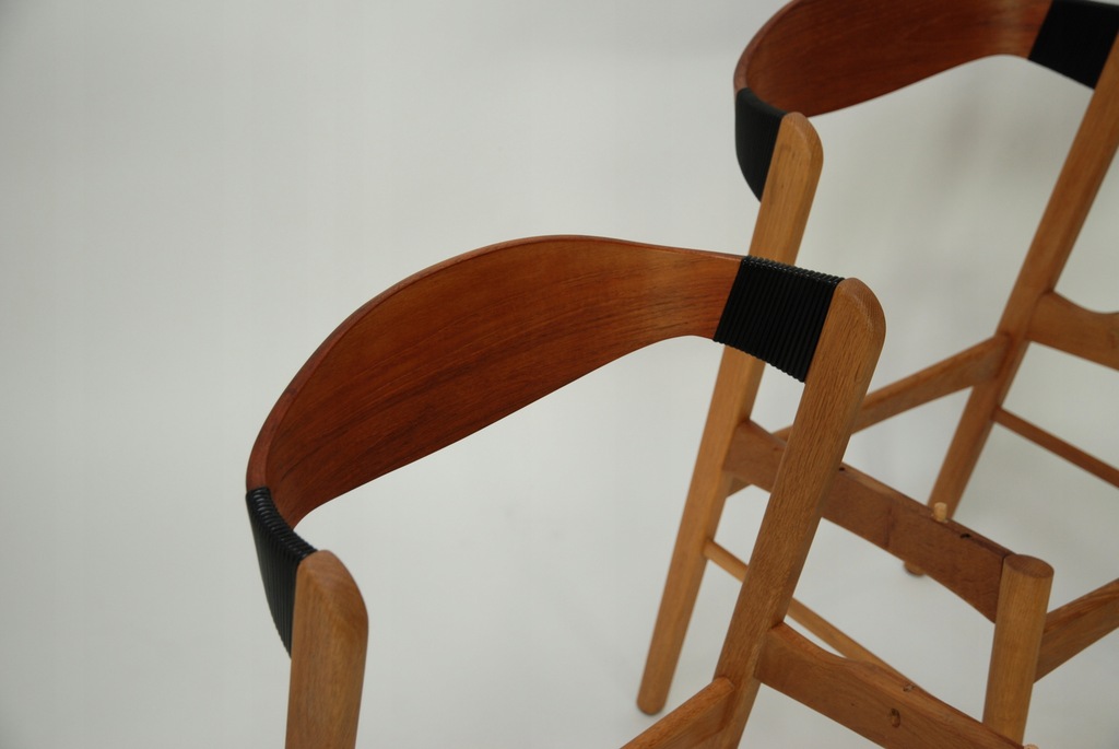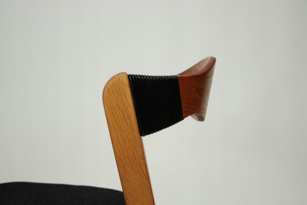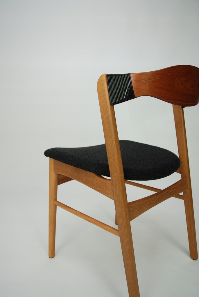 Set czterech niesztampowych, dębowych krzeseł. Bardzo ciekawe oparcie z giętej, fornirowanej tekiem sklejki. Podłokietnik wykończony winylową taśma nadającą unikatowego charakteru. Produkt duński lat 60-tych. Tapicerka do wyboru. Przyszły właściciel wybiera rodzaj i kolor poszycia. Jedno krzesło dla przykładu obite czarna wełna meblową. Cena 5900 zł za wersje z tapicerką z wełny meblowej.