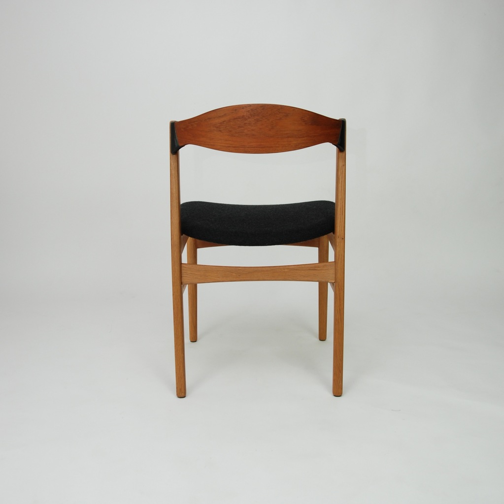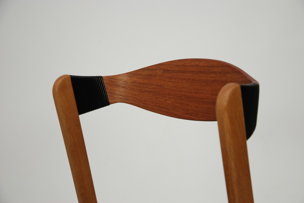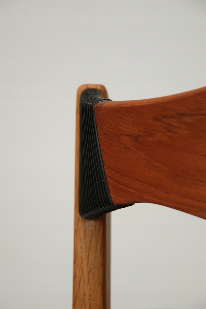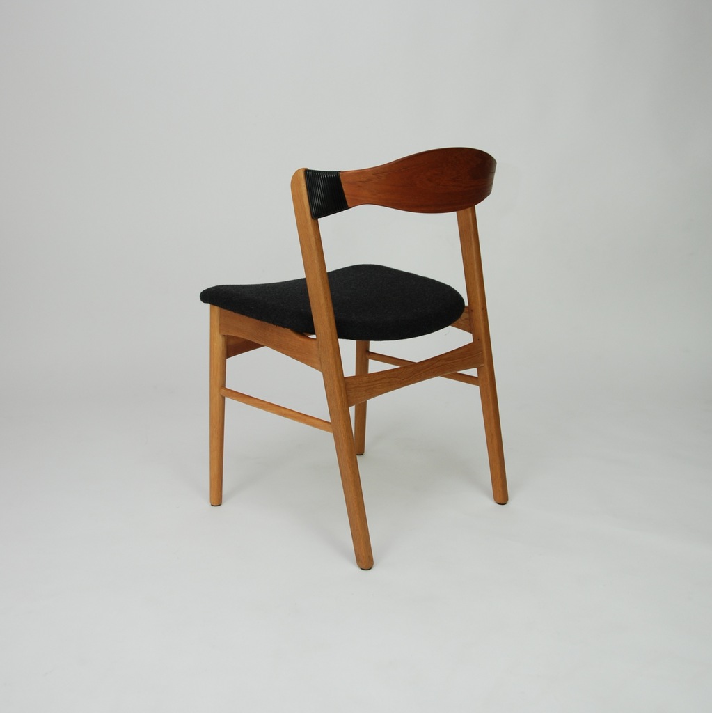 Set czterech niesztampowych, dębowych krzeseł. Bardzo ciekawe oparcie z giętej, fornirowanej tekiem sklejki. Podłokietnik wykończony winylową taśma nadającą unikatowego charakteru. Produkt duński lat 60-tych. Tapicerka do wyboru. Przyszły właściciel wybiera rodzaj i kolor poszycia. Jedno krzesło dla przykładu obite czarna wełna meblową. Cena 5900 zł za wersje z tapicerką z wełny meblowej.