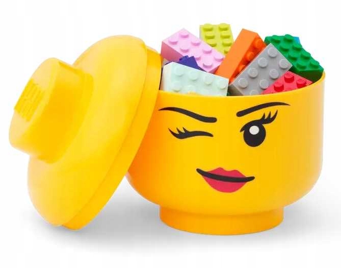 ✅Pojemnik z mocnego polipropylenu w kształcie powiększonej głowy minifigurki LEGO® z rysunkiem mrugającej buzi.