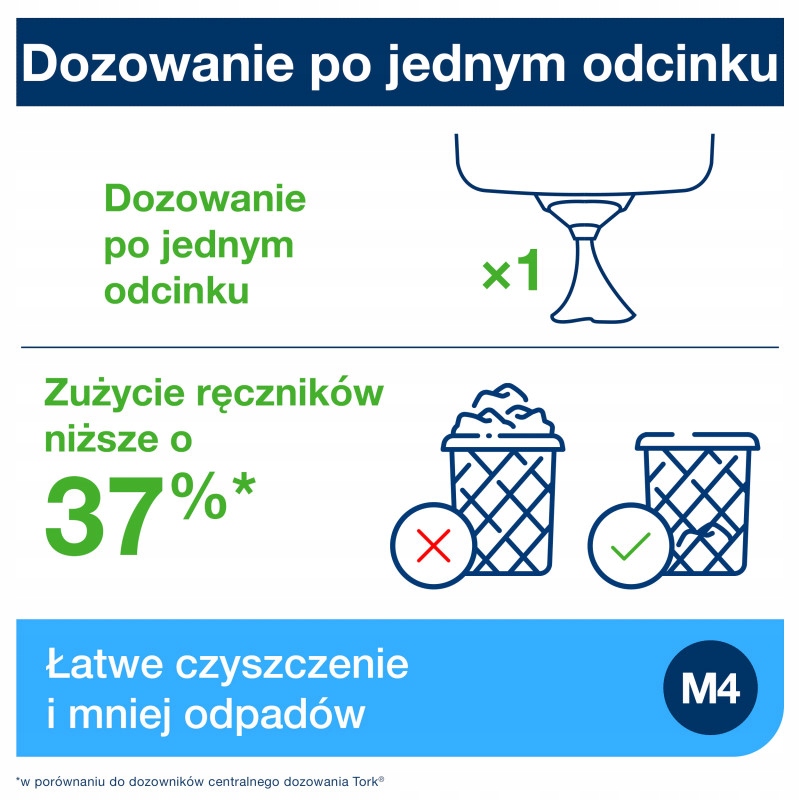 Dozownik może być wykorzystywany z ręcznikami Tork w systemie M4, których wykorzystywanie pozwoli wyraźnie zmniejszyć zużycie wkładów.