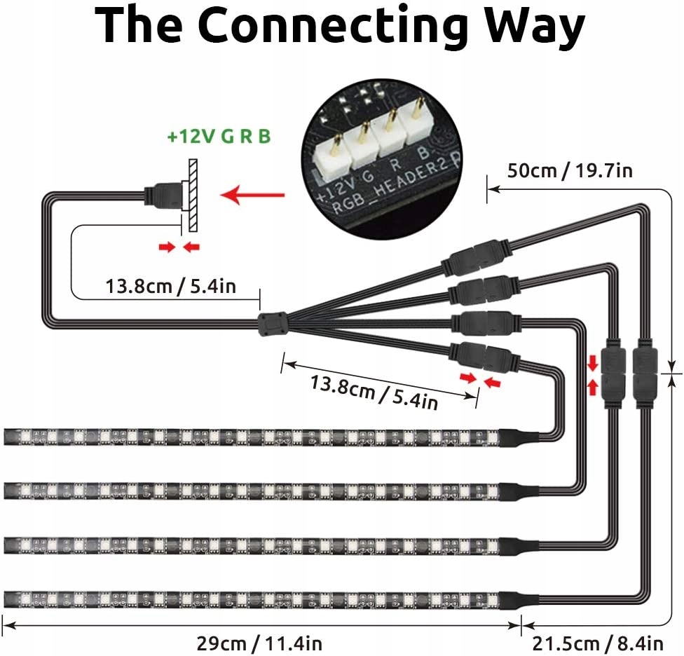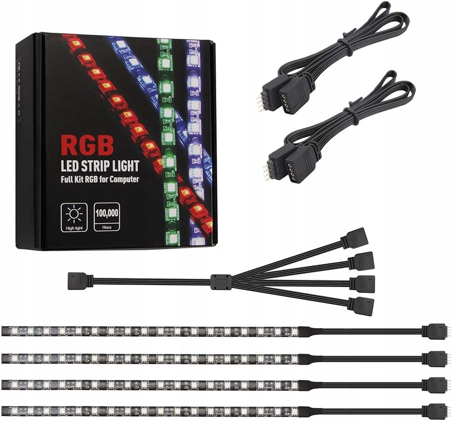- Pakiet zawiera: 4 x światła RGB do komputera (29 cm), 2 x przedłużacze do jednego z świateł komputera (50 cm), 1 x 3-drożny kabel rozgałęźny 12 V do podłączenia 4-pinowego nagłówka RGB do M/B.