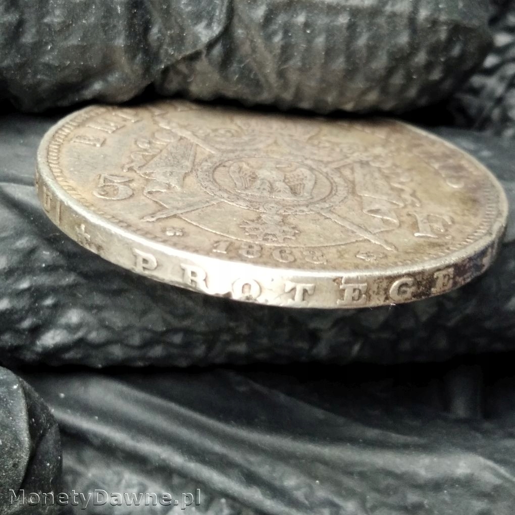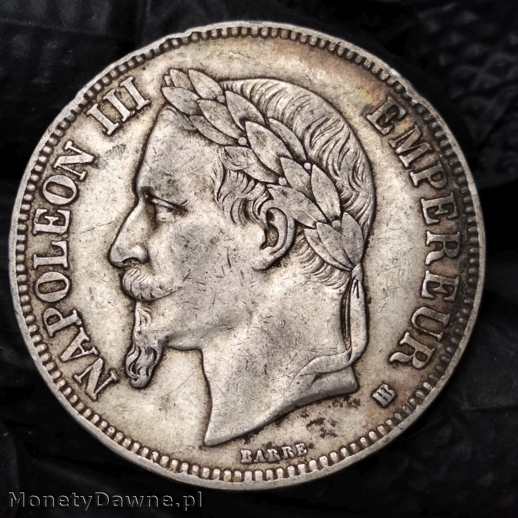 5 franków 1868 BB Strasburg, Napoleon III, Francja; dość ładny obiegowy egzemplarz, drobne uderzenie obrzeża, patyna.