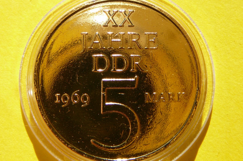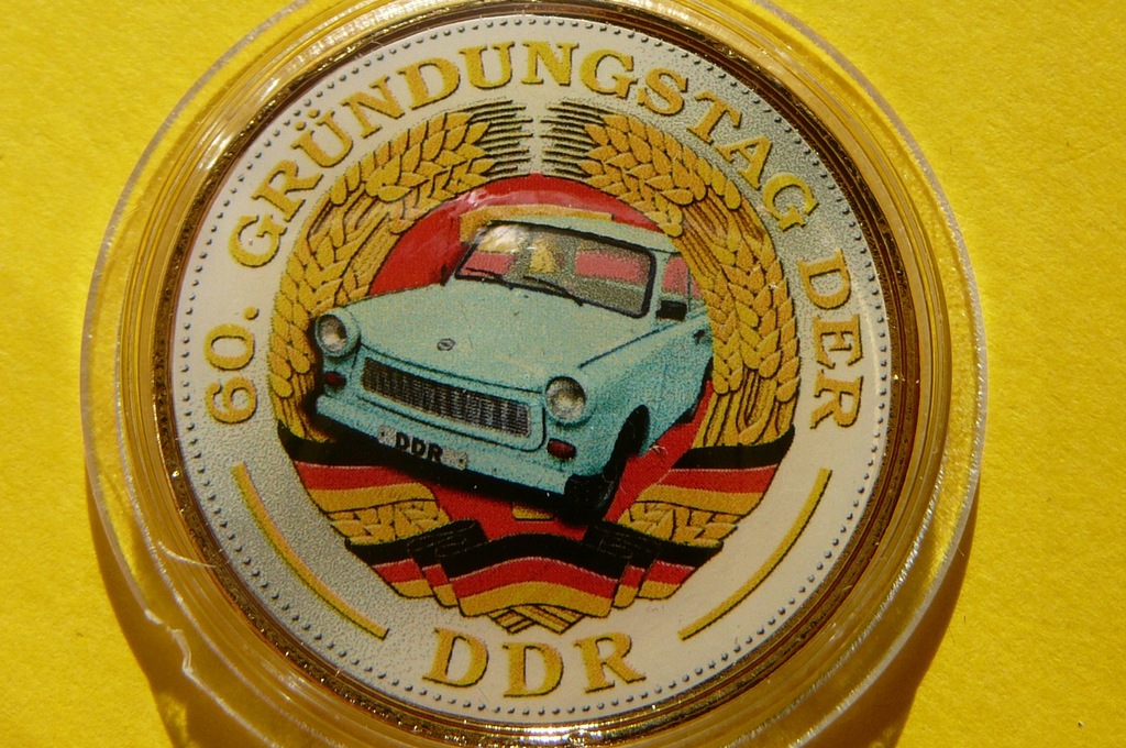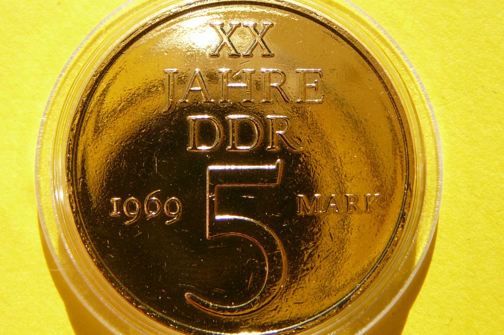 NA AUKCJI WYSTAWIANA JEST PRZEPIĘKNA JEDNA ORYGINALNA MONETA OKOLICZNOŚCIOWA PLATEROWANA CZYSTYM ZŁOTEM 24 KARAT - 5 MAREK - NRD 1969 - XX LAT DDR - AUTO TRABANT - RZADKA NAKŁAD 5TYS SZTUK + CERTYFIKAT AUTENTYCZNOŚCI - ZŁOCONA - NA INNYCH AUKCJACH WYSTAWIAM DUŻO NIEMIECKICH MONET TALARÓW i MAREK