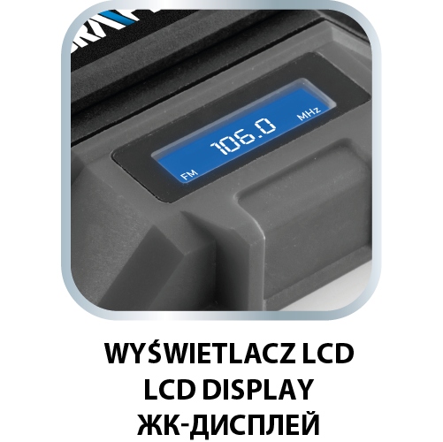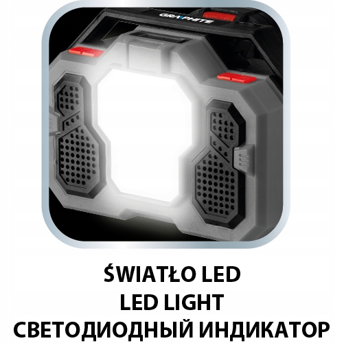 Radio akumulatorowo-sieciowe Energy + 18 V, Li-lon, bez akumulatora 58GE104 marki GRAPHITE to odporne na kurz, pył oraz delikatne obicia urządzenie, polecane na place budowy, do warsztatów majsterkowiczów oraz na hale. Zasilane zarówno za pomocą kabla podpiętego do sieci lub akumulatora litowo-jonowego 18 V (niedołączonego do zestawu). Radio posiada dwa głośniki o mocy 3 W każdy, wyświetlacz LCD, funkcję FM (87,5 – 108 mHz) oraz bluetooth, lampę LED 15 W o mocy 21 W, składaną antenę, gwint do zamocowania oraz 3 letnią gwarancję od marki GRAPHITE. To radio będzie udanym upominkiem dla każdego profesjonalisty oraz majsterkowicza.