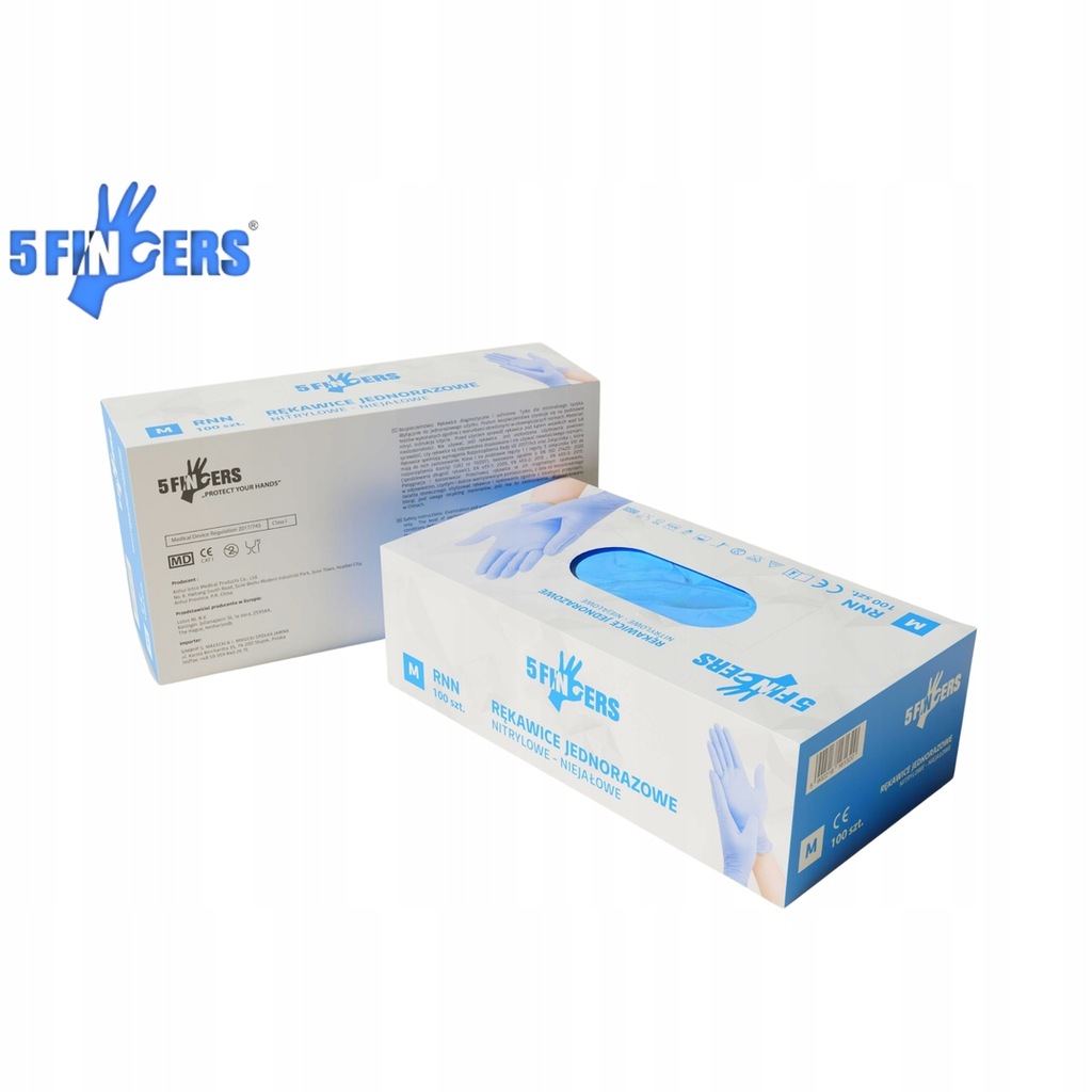 Jednorazowe, bezpudrowe rękawice nitrylowe 5FINGERS RNN: sklasyfikowane jako wyrób medyczny klasy I, zakwalifikowane również jako środek ochrony indywidualnejkategorii III uwzględniającej minimalne zagrożenia. Długość poniżej 270 mm, gramatura – 3,5 g. Produkt jest zgodny z Rozporządzeniem Parlamentu Europejskiego i Rady (UE) 2017/745 z dnia 5 kwietnia 2017 r. w sprawie wyrobów medycznych, zmiany dyrektywy 2001/83/WE, rozporządzenia (WE) nr 178/2002 i rozporządzenia (WE) nr 1223/2009 oraz uchylenia dyrektyw Rady 90/385/EWG i 93/42/EWG.