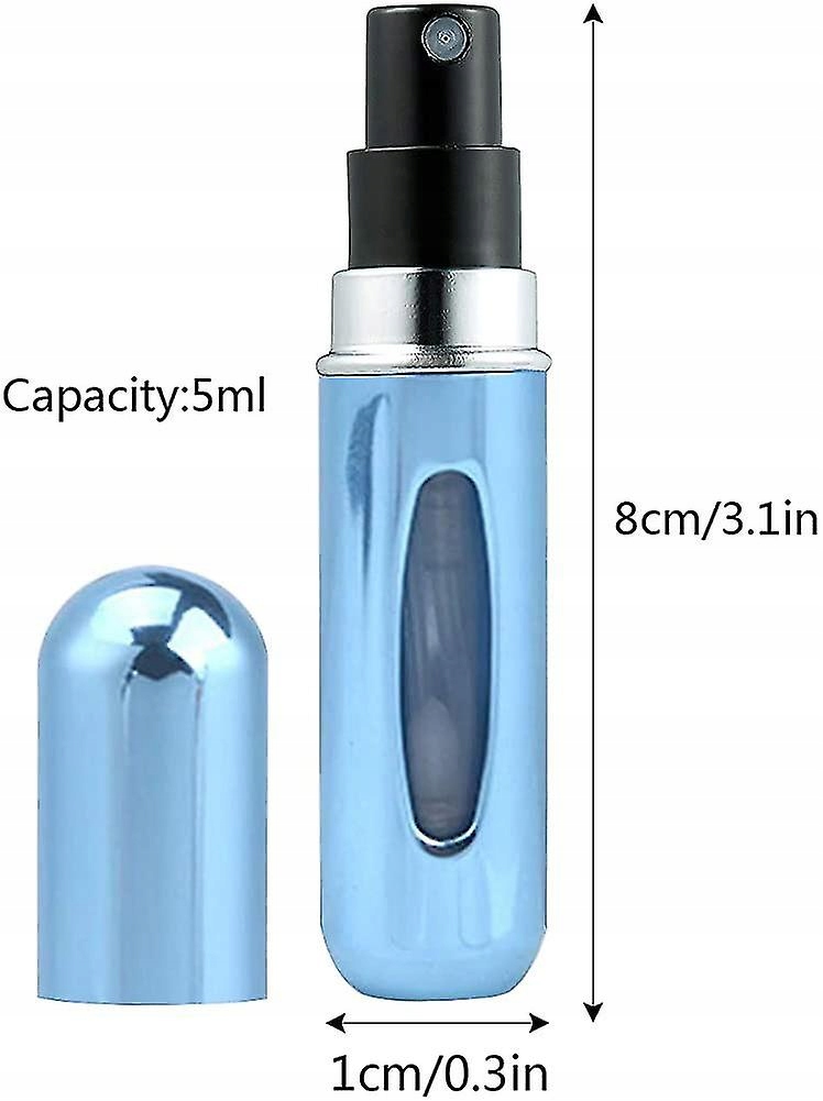 Travel size: 8.5 cm x 1.8 cm, 5 ml capacity.Material: It consists of an inner glass container and a metal shell that is not easy to break and leak. The transparent inner glass tube allows you to easily see the amount of perfume remaining.Exquisite design: Travel Perfume Spray Bottle Compact and lightweight, easy to carry, ideal for bags, wallets, tote bags and suitcases.Easy to refill and reuse: Can be refilled from the bottom in seconds using the simple pump-to-fill technology.Color bowl: You can put your different fragrances together in 4 different colors and enjoy the fresh perfume spray all the time.