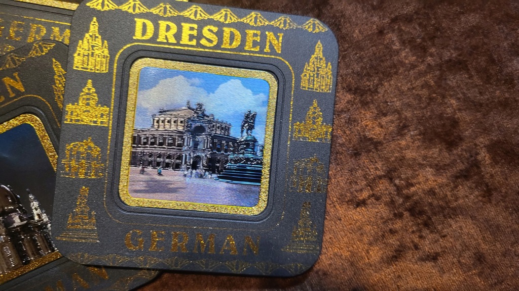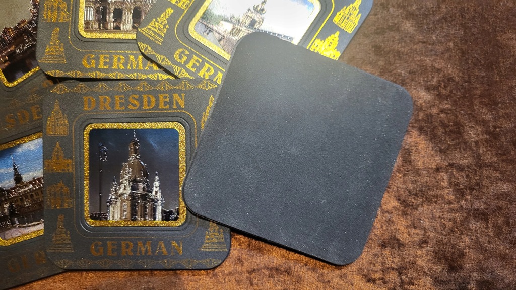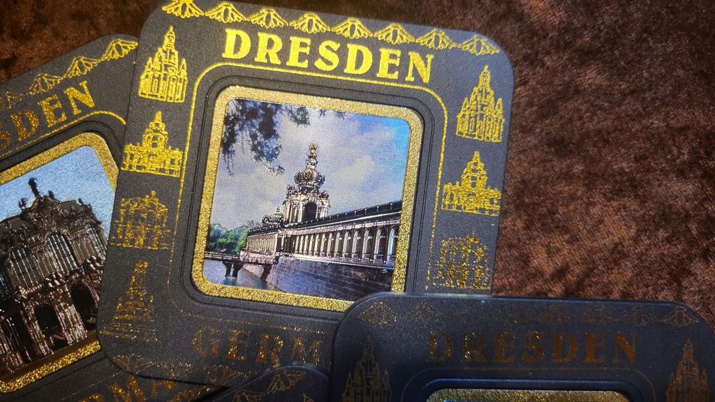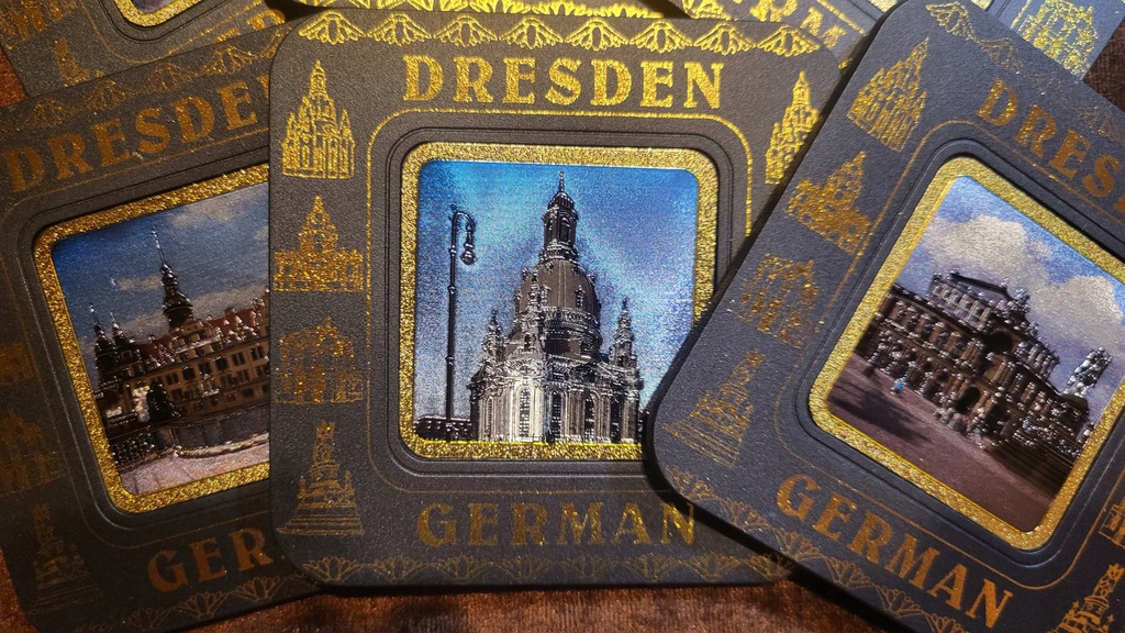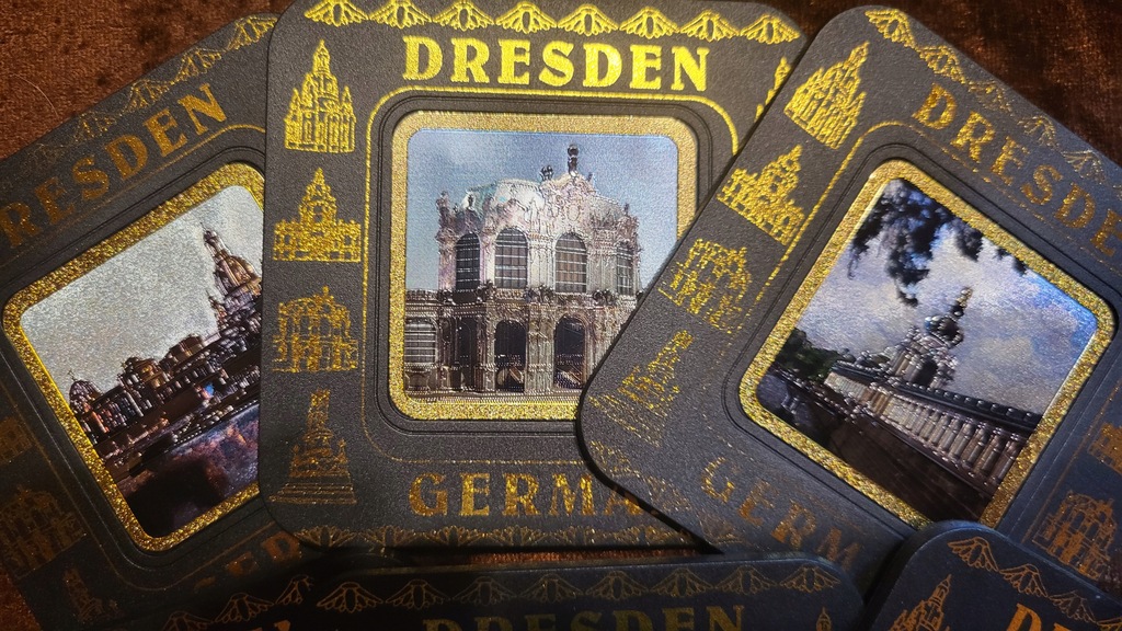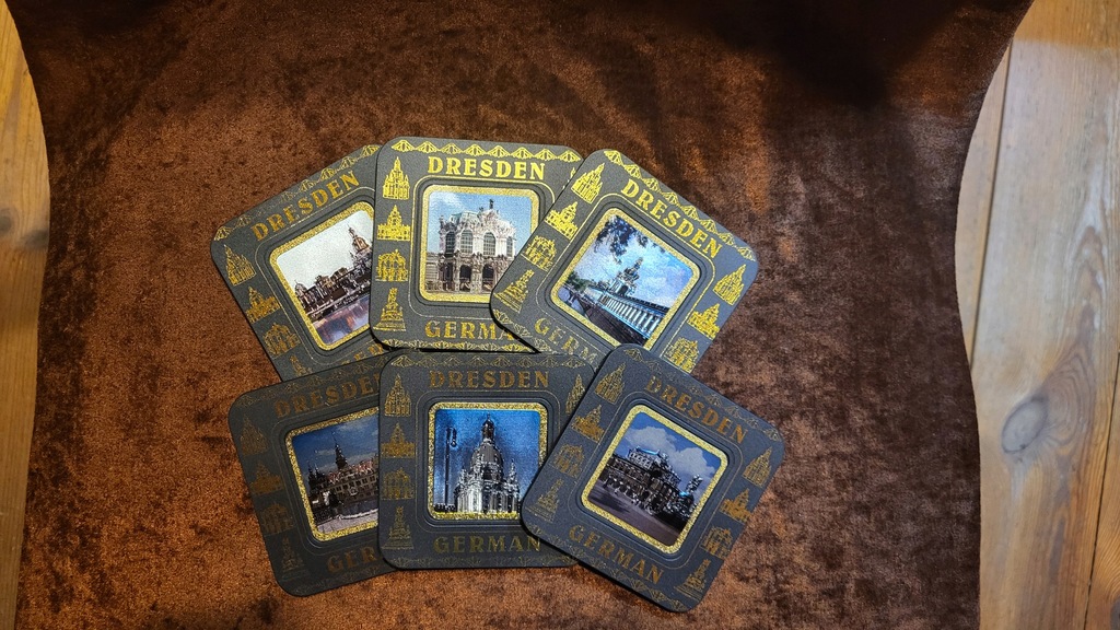 Sześć podkładek pod kubki z motywami z Drezna. W pudełeczku.
