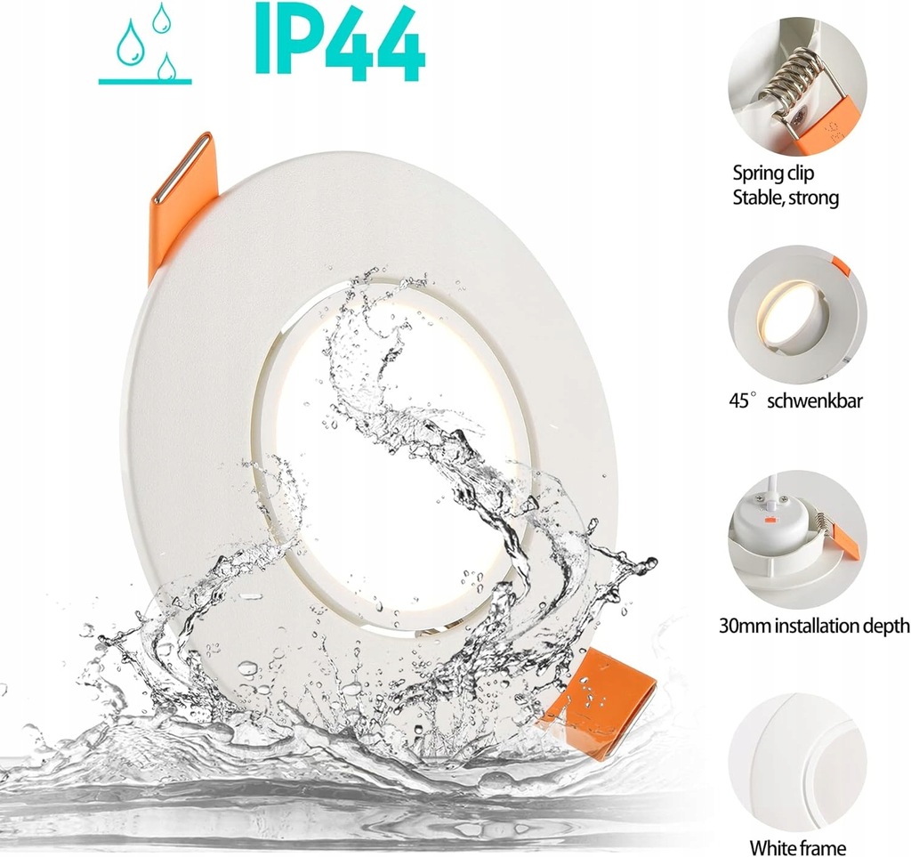 - 【IP45 z możliwością obrotu o 45°】 Punktowe wpuszczane lampy sufitowe wykorzystują trudnopalny materiał PBT (aluminium wewnątrz, PC na zewnątrz), który dobrze odprowadza ciepło. Reflektor wpuszczany z możliwością obrotu o 45°, idealny do stosowania w wilgotnych środowiskach, takich jak łazienki, kuchnie, korytarze, piwnice itp.