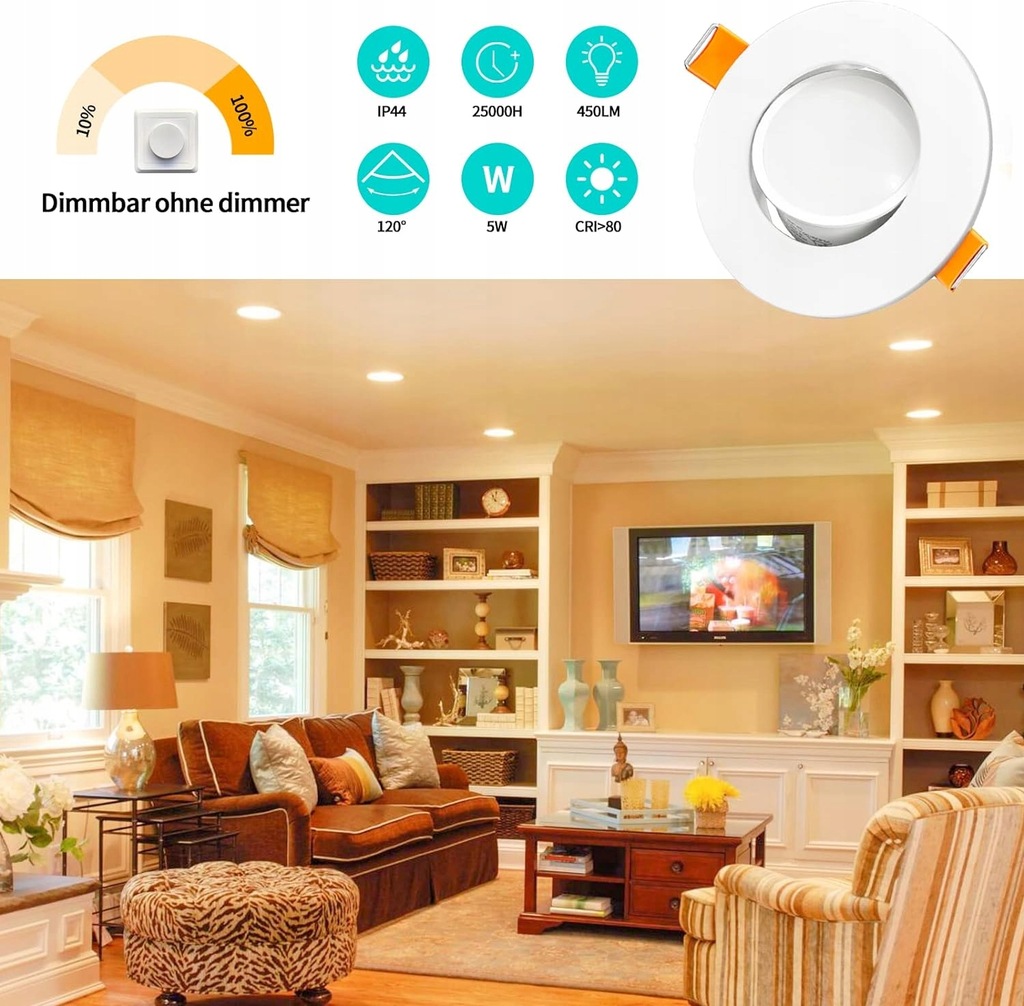 - 【Możliwość przyciemniania】 Punkty LED z możliwością przyciemniania, zakres ściemniania 10% -100%, bez migotania i szumów, tworzą inną atmosferę w Twoim pomieszczeniu, kompatybilne z większością ściemniaczy z krawędzią spływu dostępnych na rynku. Ściemniacz nie wchodzi w skład dostawy, nasze oprawy typu downlight mogą pracować również z pełną mocą bez ściemniacza.Współczynnik oddawania barw ≥80, szeroki kąt świecenia 120°, zapewnia duże i naturalne oświetlenie wnętrza.