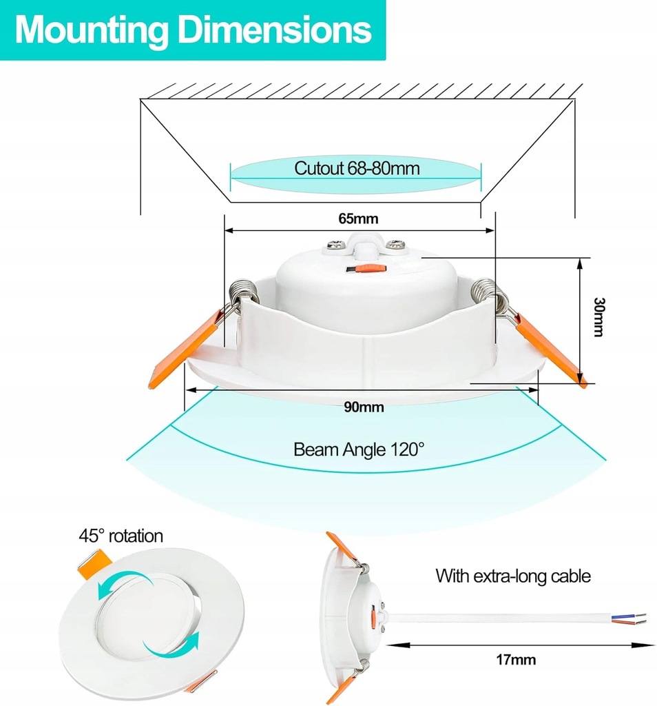 - 【Łatwa instalacja】 Ultracienkie reflektory sufitowe o głębokości montażu wynoszącej zaledwie 30 mm. Te płaskie oprawy do wbudowania idealnie nadają się do renowacji i nowych dekoracji. Średnica Ø 90 mm, wymagany rozmiar wycięcia w suficie Ø 68-80 mm Bezpośrednie podłączenie do sieci 230 V, bez dodatkowych transformatorów i akcesoriów.