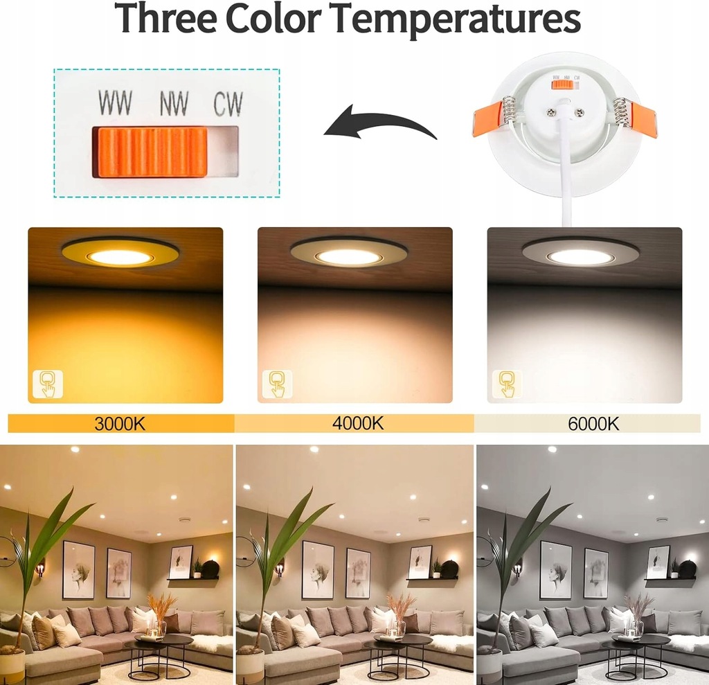 - 【3 temperatury barwowe do wyboru】 Płaski reflektor wpuszczany LED 230 V, temperaturę barwową można ustawić na 3000 K (ciepła biel) lub 4000 K (neutralna biel) lub 6000 K (zimna biel), którą można regulować za pomocą przełącznika suwakowego na tył lampy Przetestuj instalację i wybierz najbardziej odpowiednią