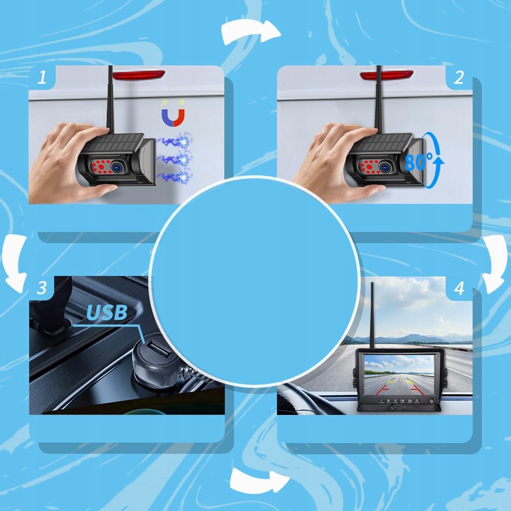 Bezprzewodowa słoneczna kamera cofania: Ta bezprzewodowa magnetyczna kamera cofania jest wyposażona w panel słoneczny i duży akumulator. Może pracować przez 16 godzin i może kontynuować ładowanie podczas jazdy lub postoju, dzięki czemu jest energooszczędny.