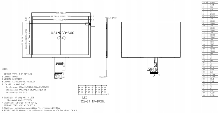 Wyświetlacz 7" 1024x600 TFT LCD z kontrolerem do Raspberry Pi - specyfikacja: