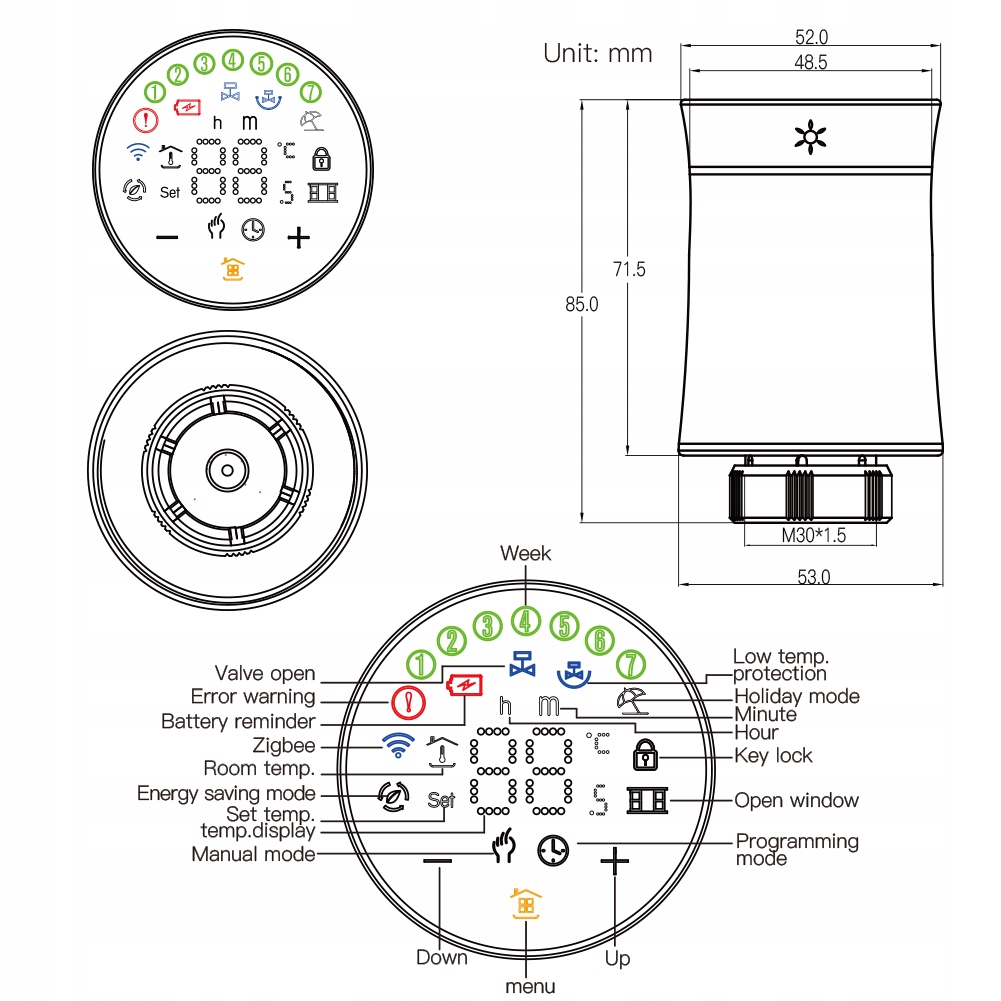 3. 【Programowalny harmonogram】 Obsługuje ręczną konfigurację tygodniowego harmonogramu 5+2, ustaw inny harmonogram dla każdego pokoju. Dostępny tryb wakacyjny, tryb automatyczny, tryb temphand i tryb ręczny;
