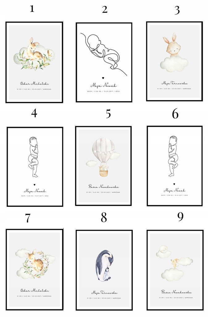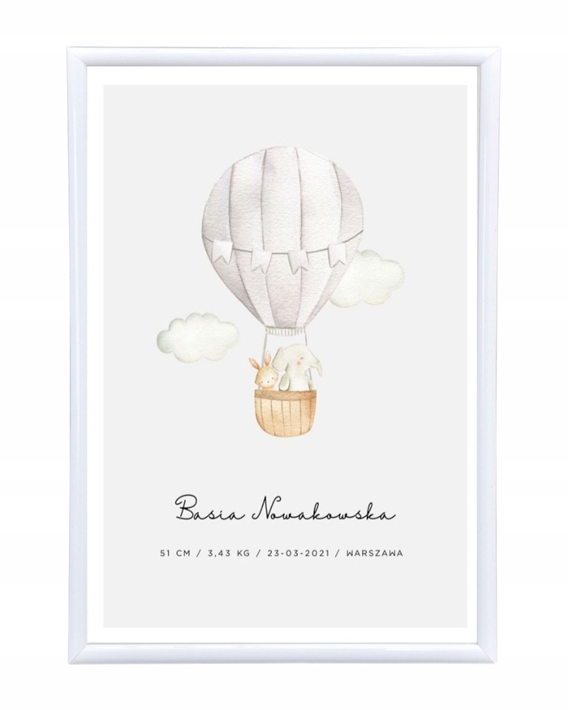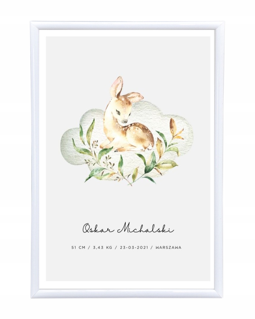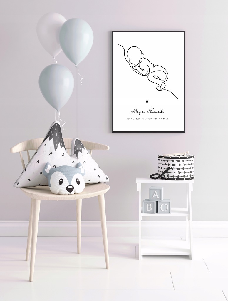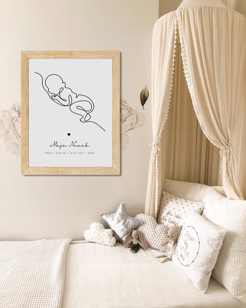 Plakat metryczka zawierająca najważniejsze dane z dnia narodzin dziecka.
