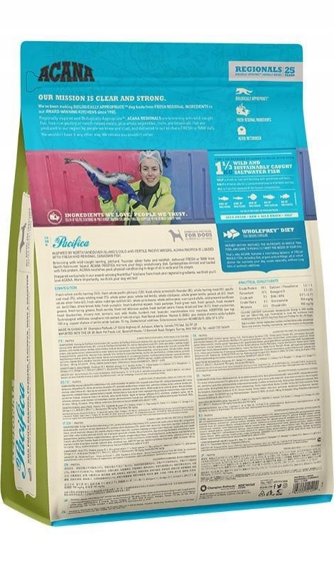 Specyfikacja Waga produktu 2 kg Specyficzne potrzeby zwierzęcia Brak szczególnych potrzeb Rasa psa Każda rasa Zawiera witaminy Witamina E Zawiera witaminy Witamina D3 Wiek zwierzęcia Uniwersalne Rozmiar rasy Średnie (11 - 25 kg) Rozmiar rasy XS (<4 kg) Rozmiar rasy Gigant (> 45 kg) Rozmiar rasy Mini (5 - 10 kg) Rozmiar rasy Maxi (26 - 44 kg) Efekty zdrowotne Zdrowie ogólne Smak karmy Ryba Mieszanka karm Świeży cały śledź (14%), świeże całe sardynki (12%), świeża cała fladra strzałozębna (8%), cały dehydratyzowany śledź (8%), dehydratyzowany dorsz (7%), cały dehydratyzowany morszczuk (7%), cały groch zielony, cała czerwona soczewica, cała ciecierzyca, cała zielona soczewica, olej z rdzawca (6%), świeży cały morszczuk (4%), świeży cały karmazyn czerwonopasy (4%), cała fasola pinto, cały groch żółty, lucerna, olej słonecznikowy tłoczony na zimno, włókno soczewicy, suszony brązowy kelp, świeża dynia, świeża dynia piżmowa, świeży pasternak, świeży jarmuż, świeży szpinak, świeża kapusta sitowata, świeże liście rzepy, świeża marchew, świeże jabłka red delicious, świeże gruszki bartlett, liofilizowana wątroba dorsza (0,1%), świeża żurawina, świeże borówki, korzeń cykorii, kurkuma, ostropest plamisty, korzeń łopianu, kwiat lawendy, korzeń prawoślazu lekarskiego, owoce dzikiej róży. Zawartość witaminy E 200 mg/kg Popiół surowy 7% Fosfor 1,1% Zawartość kwasu pantotenowego (witaminy B5) 23 mg/kg Białko 35% Zawartość tiaminy (witaminy B1) 21 mg/kg Zawartość ryboflawiny (witaminy B2) 21,2 mg/kg Zawartość witaminy B6 18 mg/kg Zawartość tłuszczu 17% Zawartość selenu 0,85 mg/kg Zawartość witaminy D3 2500 IU/kg Zawartość niacyny (witaminy B3) 150 mg/kg Zawartość potasu 0,85% Włókna surowe 6% Zawartość kwasu foliowego (witamina B9) 2,15 mg/kg Zawartość manganu 17 mg/kg Zawartość chlorku choliny (na 100 g) 210 mg Zawartość witaminy B12 200 μg/kg Zawartość jodu 3,14 mg/kg Zawartość cynku 180 mg/kg Zawartość wilgoci 12% Zawartość miedzi 24 mg/kg Wapń 1,5% Sód 0,45% Zawartość żelaza 150 mg/kg Zawartość magnezu 0,1% Zawartość witaminy A 11000 IU/kg Kwasy tłuszczowe omega-3 2% Szerokość 350mm Długość 220mm Wysokość 90mm