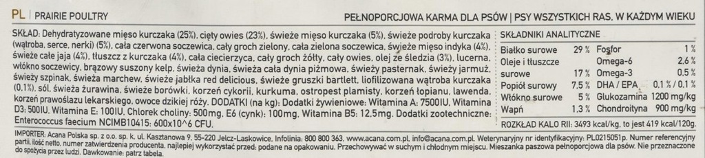Specyfikacja Rasa psa Każda rasa Wiek zwierzęcia Uniwersalne Waga produktu 11,4 kg Skład Dehydratyzowane mięso kurczaka (25%), cięty owies (23%), świeże mięso kurczaka (5%), świeże podroby kurczaka (wątroba, serce, nerki) (5%), cała czerwona soczewica, cały groch zielony, cała zielona soczewica, świeże mięso indyka (4%), świeże całe jaja (4%), tłuszcz z kurczaka (4%), cała ciecierzyca, cały groch żółty, cały owies, olej ze śledzia (3%), lucerna, włókno soczewicy, brązowy suszony kelp, świeża dynia, świeża cała dynia piżmowa, świeży pasternak, świeży jarmuż, świeży szpinak, świeża marchew, świeże jabłka red delicious, świeże gruszki bartlett, liofilizowana wątroba kurczaka (0.1%), sól, świeża żurawina, świeże borówki, korzeń cykorii, kurkuma, ostropest plamisty, korzeń łopianu, lawenda, korzeń prawoślazu lekarskiego, owoce dzikiej róży. Zawiera witaminy Tiamina Zawiera witaminy Witamina D3 Zawiera witaminy Witamina B6 Zawiera witaminy Vitamin B9 (folic acid) Zawiera witaminy Witamina B2 Zawiera witaminy Witamina E Zawiera witaminy Witamina B5 Zawiera witaminy Witamina B12 Zawiera witaminy Witamina A Zawiera witaminy Niacyna Zawartość selenu 0,4 mg/kg Kwasy tłuszczowe omega-3 0,5% Zawartość żelaza 190 mg/kg Wapń 1,3% Zawartość jodu 1,9 mg/kg Zawartość miedzi 23 mg/kg Zawartość tłuszczu 17% Białko 29% Zawartość manganu 24 mg/kg Zawartość wilgoci 12% Fosfor 1% Popiół surowy 7,5% Zawartość magnezu 0,1% Włókna surowe 5% Zawartość cynku 220 mg/kg Szerokość 500mm Długość 140mm Wysokość 380mm
