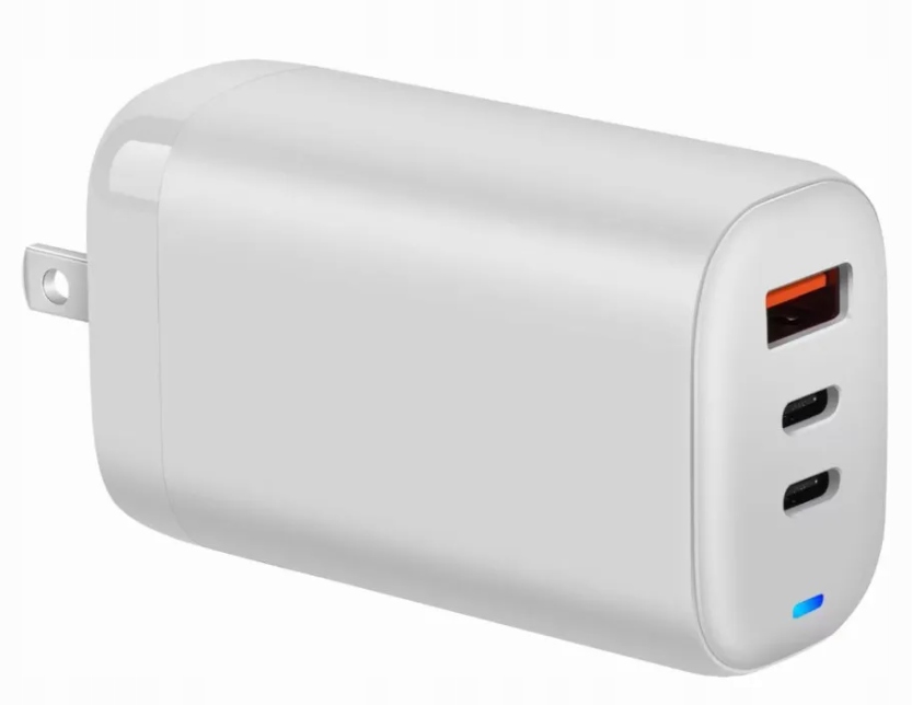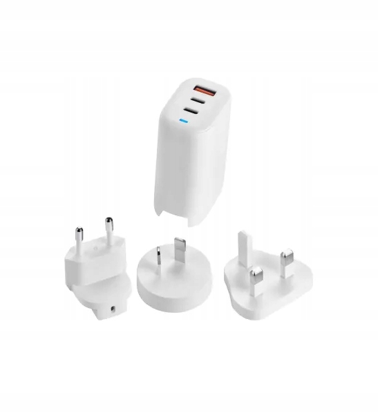 Zasilacz sieciowy z obsługą szybkiego ładowania, całkowita moc: 65 W, wyjścia: 1 × USB-A i 2 × USB-C, technologia szybkiego ładowania: nie obsługuje, wskaźnik ładowania, przewód ze złączem USB-C