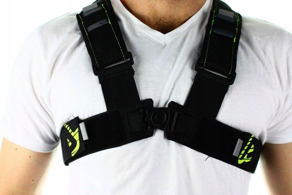 - mocowany na szelki w kształcie X z czterema regulowanymi paskami na rzep
