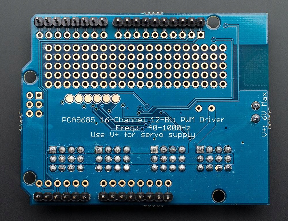 - Ten shield ma sterownik PWM sterowany poprzez I2C z wbudowanym zegarem. Oznacza to, że w przeciwieństwie do rodziny TLC5940, nie musisz ciągle wysyłać sygnału który zajmuje Twój mikrokontroler, działa całkowicie 'free running'!
